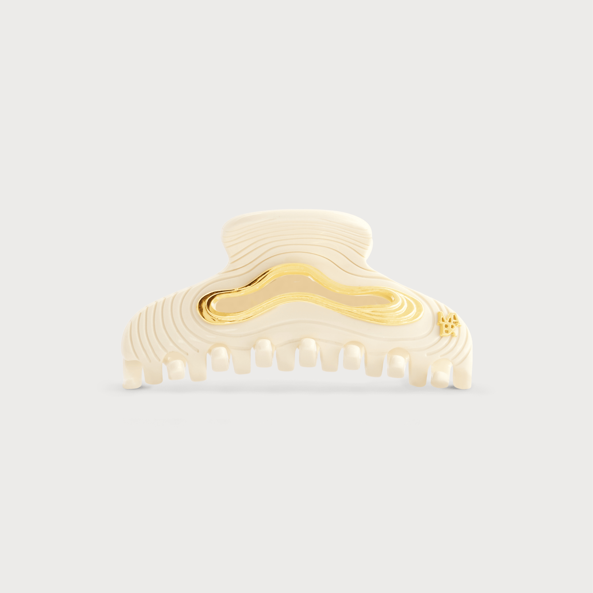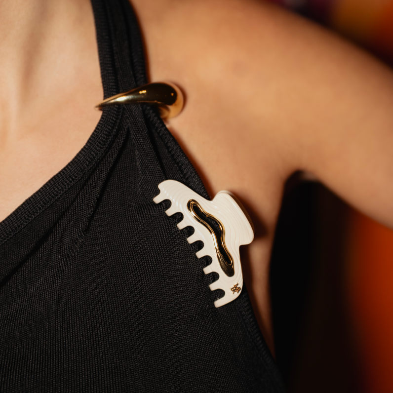 The Wave hair claw is made of goldened brass and Italian cellulose acetate, an eco-friendly material derived from cotton flowers. It is biodegradable and smooth on the hair.