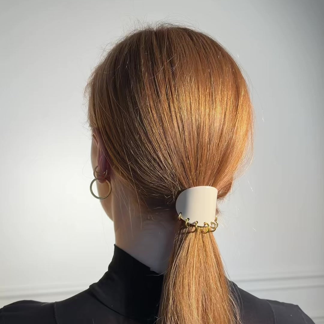 Introducing the Piercing hair tie, a luxury piece designed by our creative studio in Paris and handcrafted in our workshops in the Jura region. This hair accessory is entirely Made in France. Drawing inspiration from the worlds of jewelry and leather goods, Mauliébris ingeniously incorporates those influences by playing with an arrangement of rings, reminiscent of skin piercings. Made from brass and delicately gilded with fine gold, the rings in this collection bestow a precious and alluring "jewel-like" appearance to the acetate material, giving the product a contemporary look. It can be customized with a gold brass letter or a rhinestone zodiac charm.
