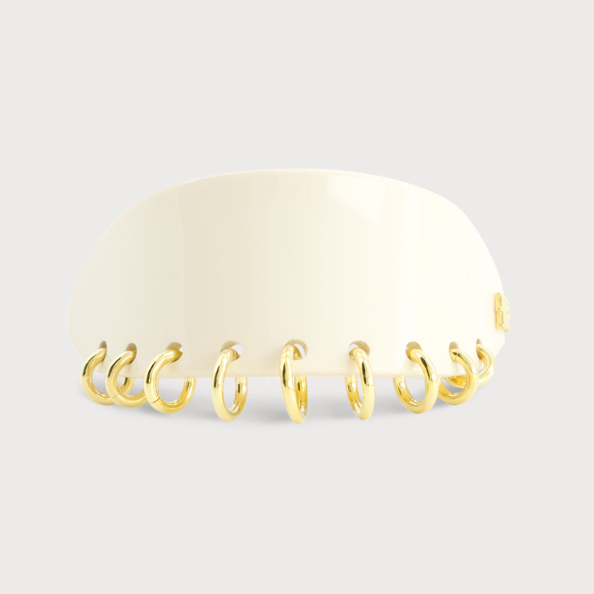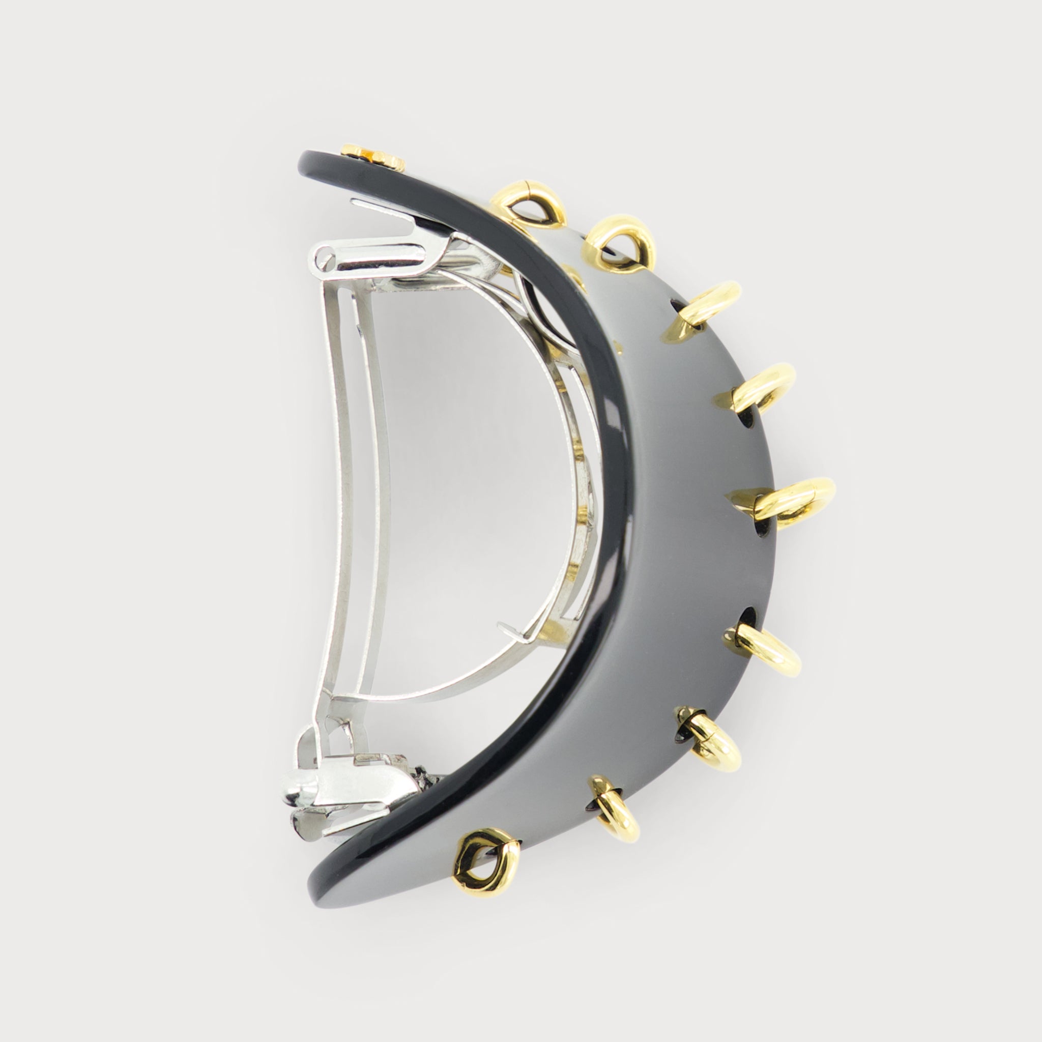 Introducing the Piercing barrette, a luxury piece designed by our creative studio in Paris and handcrafted in our workshops in the Jura region. This accessory is entirely Made in France. Drawing inspiration from the worlds of jewelry and leather goods, Mauliébris ingeniously incorporates those influences by playing with an arrangement of rings, reminiscent of skin piercings. Made from brass and delicately gilded with fine gold, the rings in this collection bestow a precious and alluring "jewel-like" appearance to the acetate material, giving the product a contemporary look. The Piercing barrette is a highly curved barrette perfect for ponytails. Its soft, firm hold will hold medium to very thick hair.