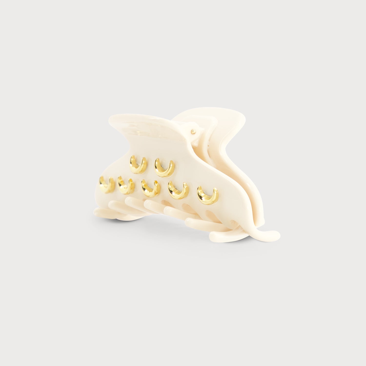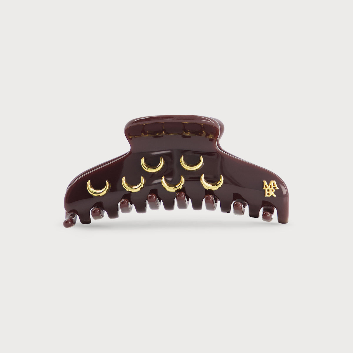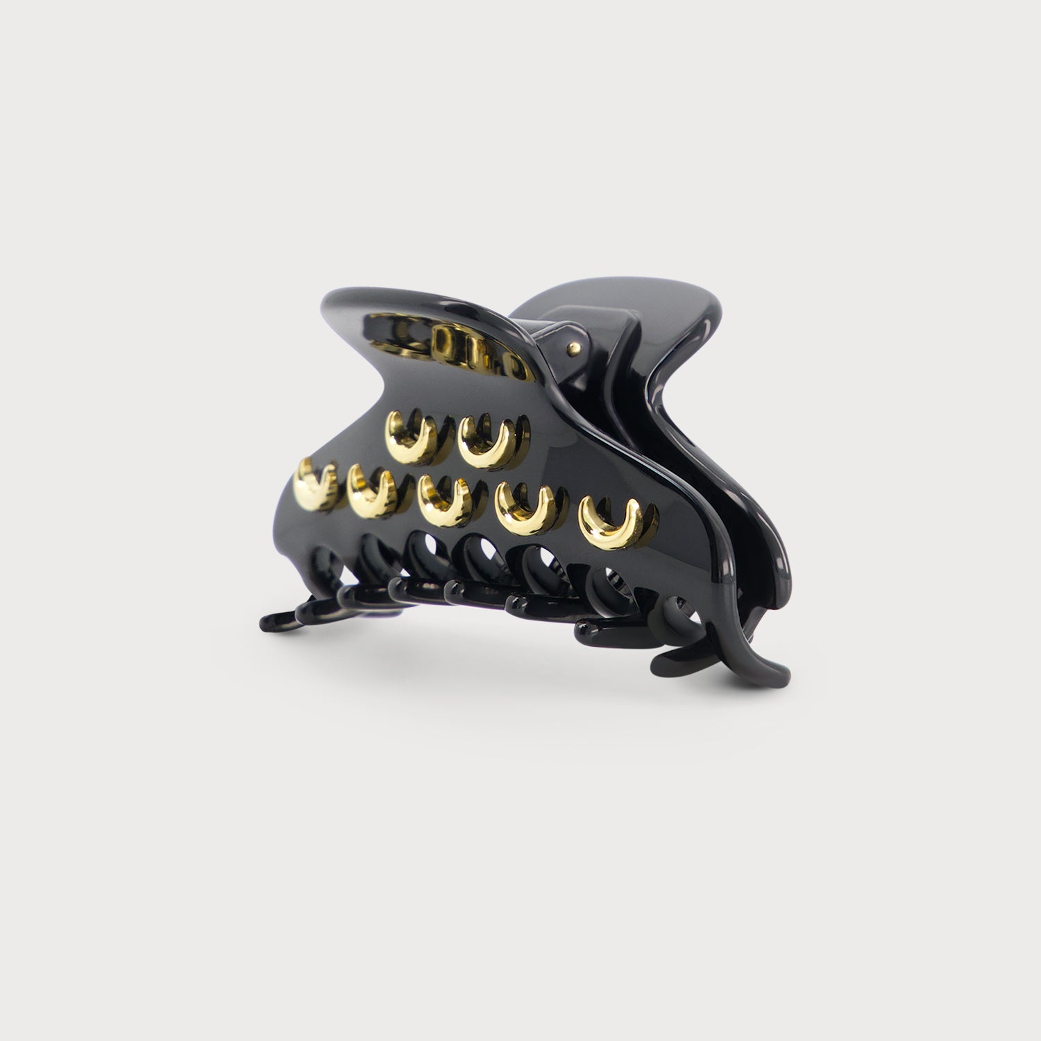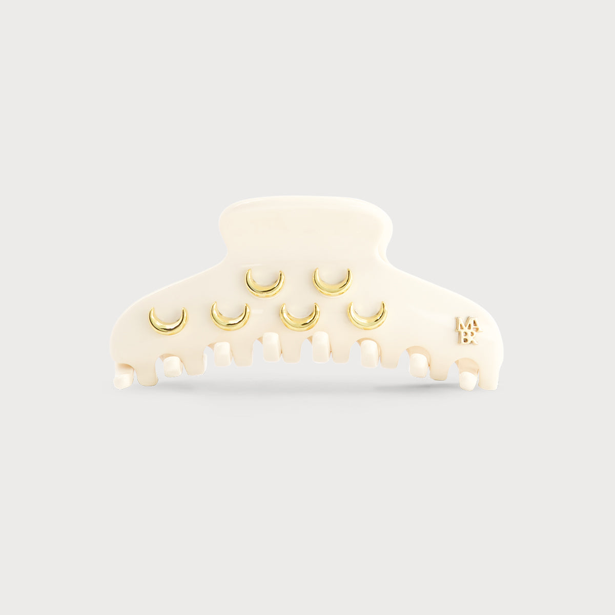 Designed in Paris by our creative studio and handmade in the Jura region by our workshops, the Clair de Lune hair claw is a luxury piece entirely Made in France. Claire de Lune is adorned with a constellation of golden crescents, delicately scattered across the acetate. The contrast between the metallic shine and the softness of the material creates a subtle and refined play of light. Sculptural and luminous, the clip becomes a jewel, graced with a celestial pattern that evokes the magic of a starry sky. With a length of 7cm, the Eyelets claw is designed for everyday styling. Whether in a sophisticated half-up hairstyle, an elegant bun, or a chic updo. Its spring is flexible and resistant, and it has a double inner row of teeth that provide a gentle hold for the hair.