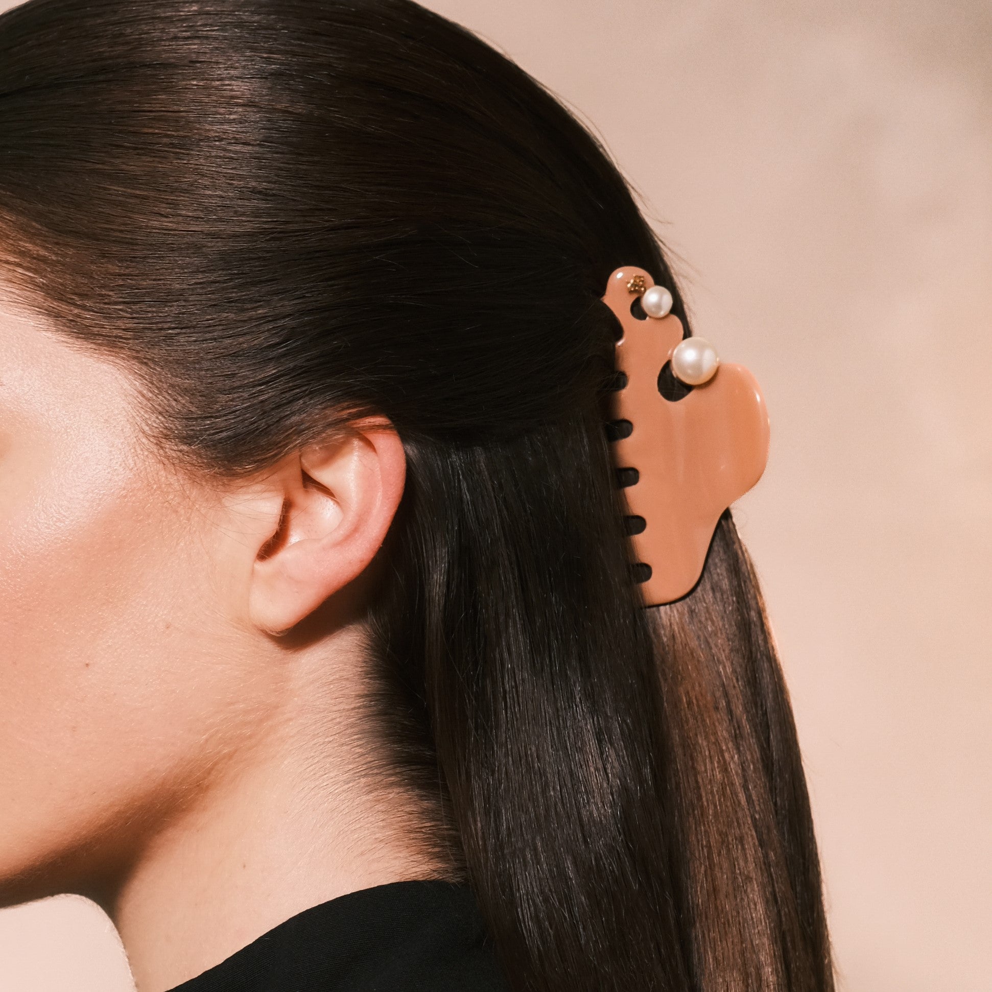 Introducing the Pearl claw, a luxury piece designed by our creative studio in Paris and handcrafted in our workshops in the Jura region. This accessory is entirely Made in France. Inspired by the All Over pearls trend coming from jewelry, Mauliébris plays with the contours of oversized pearls on pieces with soft colors and organic shapes that envelop the pearly ornaments.