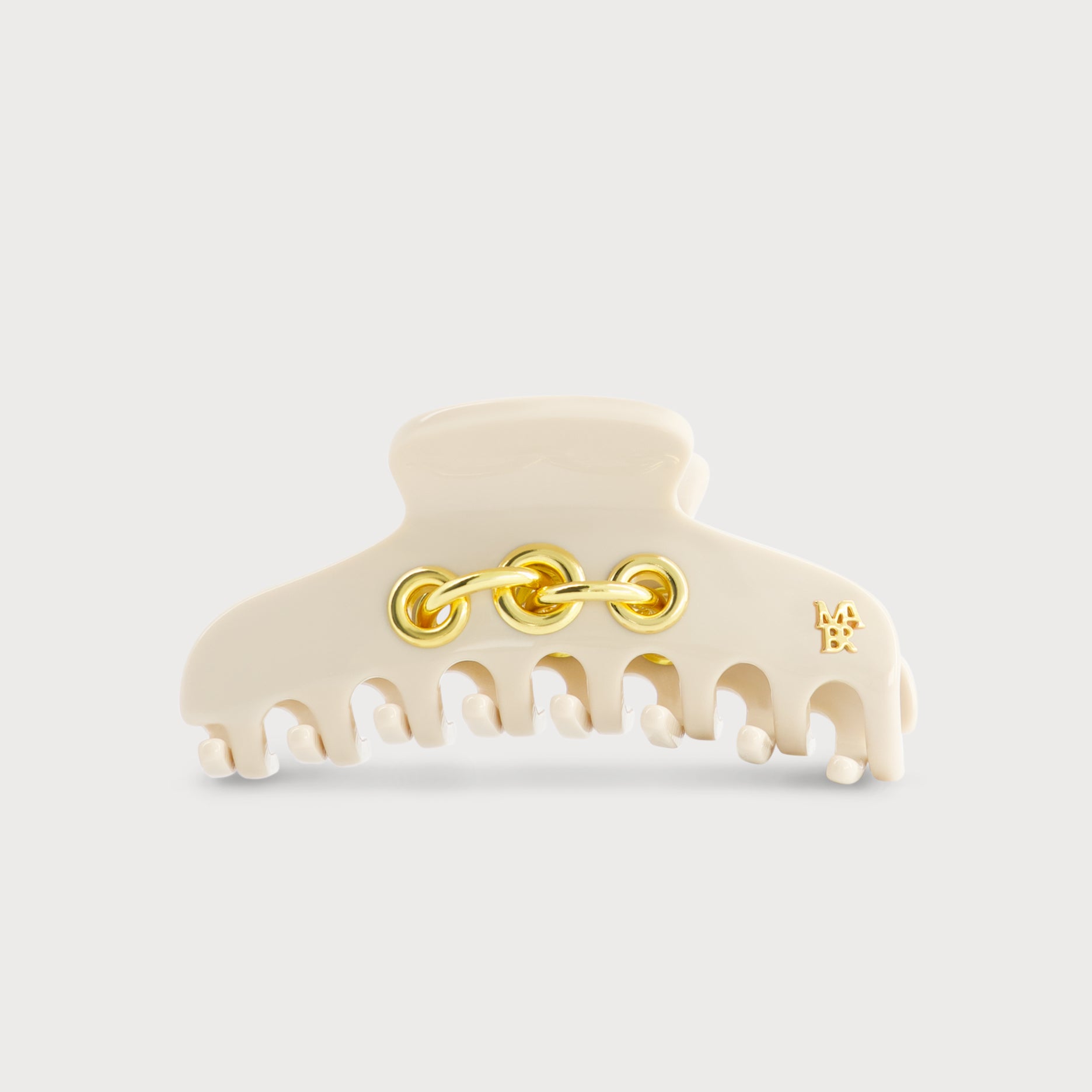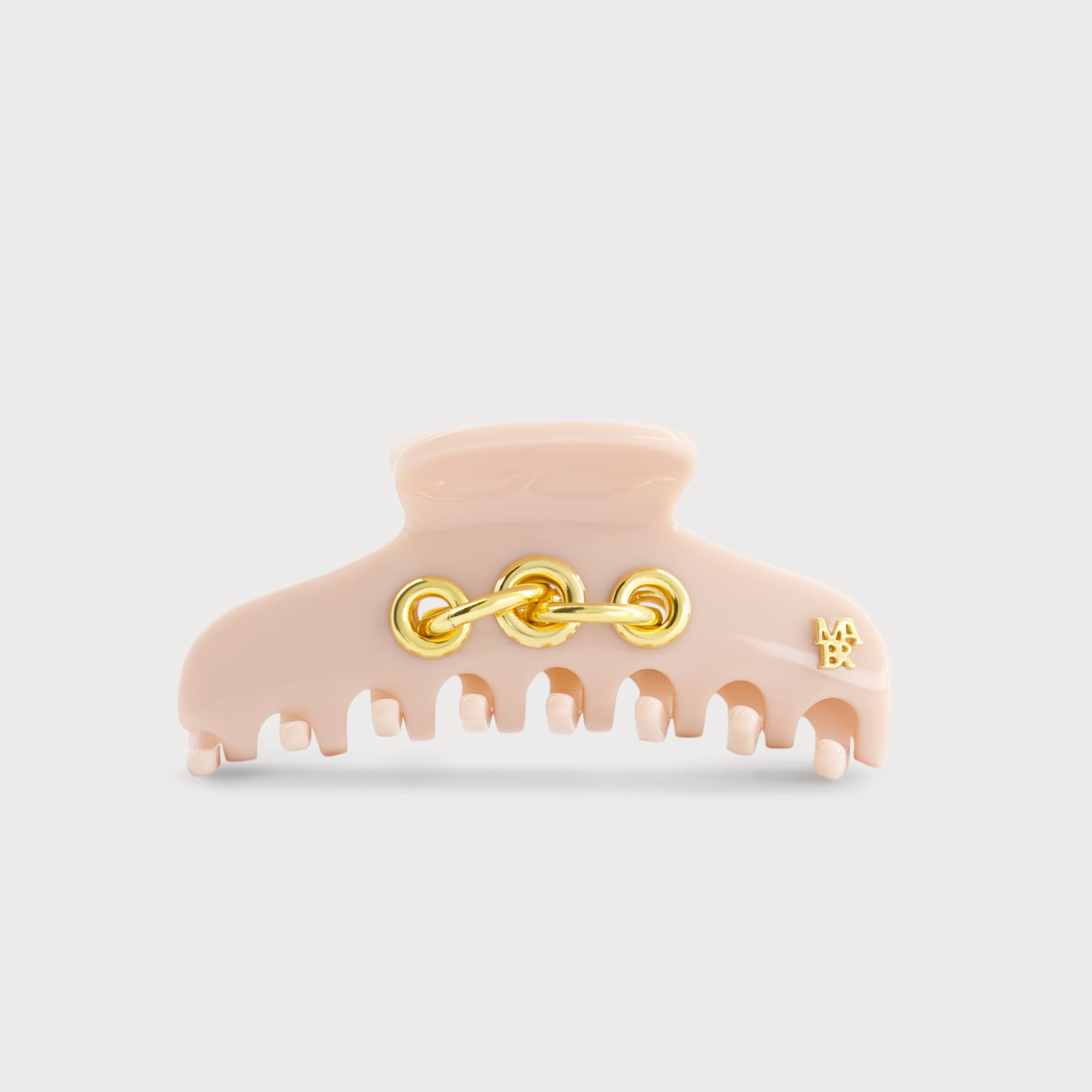 Introducing the Eyelets hair claw, a luxury piece designed in collaboration with Kalon and handcrafted in our workshops in the Jura region. This accessory is entirely Made in France. Initially drawing inspiration from the world of fine jewelry and leather goods, Mauliébris incorporates those elements by delicately adorning its pieces with eyelets and cleverly playing with interlocking rings, reminiscent of skin piercings. Made from meticulously gold-plated brass, these intricate embellishments give the acetate material a precious and jewelry-like appearance, giving a fresh and contemporary allure to the product. he acetate color is a pale nude-pink hue reminiscent of stage veils and costumes — created with Kalon.