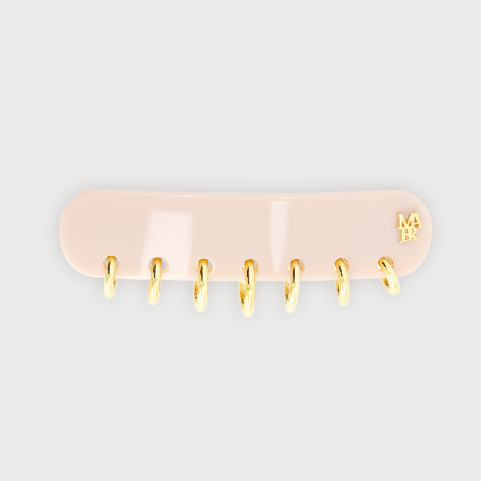 Introducing the Piercing barrette, a luxury piece designed in collaboration with Kalon and handcrafted in our workshops in the Jura region. This accessory is entirely Made in France. Drawing inspiration from the worlds of jewelry and leather goods, Mauliébris ingeniously incorporates those influences by playing with an arrangement of rings, reminiscent of skin piercings. Made from brass and delicately gilded with fine gold, the rings in this collection bestow a precious and alluring "jewel-like" appearance to the acetate material, giving the product a contemporary look. The acetate color is a soft pink shade inspired by the delicate, feminine world of dance — from our collaboration with Kalon.