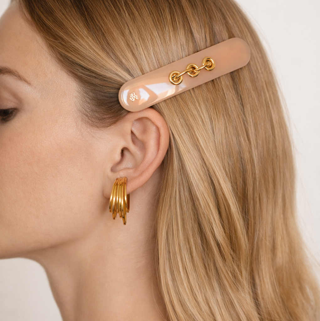 Introducing the Eyelets hair clip, a luxury piece designed by our creative studio in Paris and handcrafted in our workshops in the Jura region. This accessory is entirely Made in France. Initially drawing inspiration from the world of fine jewelry and leather goods, Mauliébris incorporates those elements by delicately adorning its pieces with eyelets and cleverly playing with interlocking rings, reminiscent of skin piercings. Made from meticulously gold-plated brass, these intricate embellishments give the acetate material a precious and jewelry-like appearance, giving a fresh and contemporary allure to the product. The clip features our Vogue-acclaimed anti-slip mechanism, which protects the hair and holds it in place. It can be customized with a gold brass letter or a rhinestone zodiac charm.