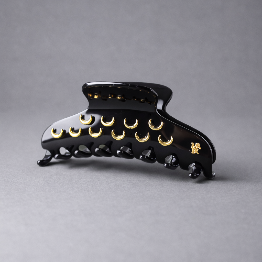 Imaginée à Paris par notre studio créatif et fabriquée à la main dans le Jura par nos ateliers, la pince à cheveux Clair de Lune est une pièce de luxe intégralement Made in France. Claire de Lune se pare d’une constellation de petits croissants dorés, délicatement posés sur l’acétate. Le contraste entre l’éclat métallique et la douceur de la matière crée un jeu de lumière subtil et raffiné. Sculpturale et lumineuse, la pince se fait bijou, parée d’un motif céleste qui évoque la magie d’un ciel étoilé. Son ressort est souple et résistant, et elle possède une double rangée intérieure de dents qui permettent un maintien doux pour les cheveux.