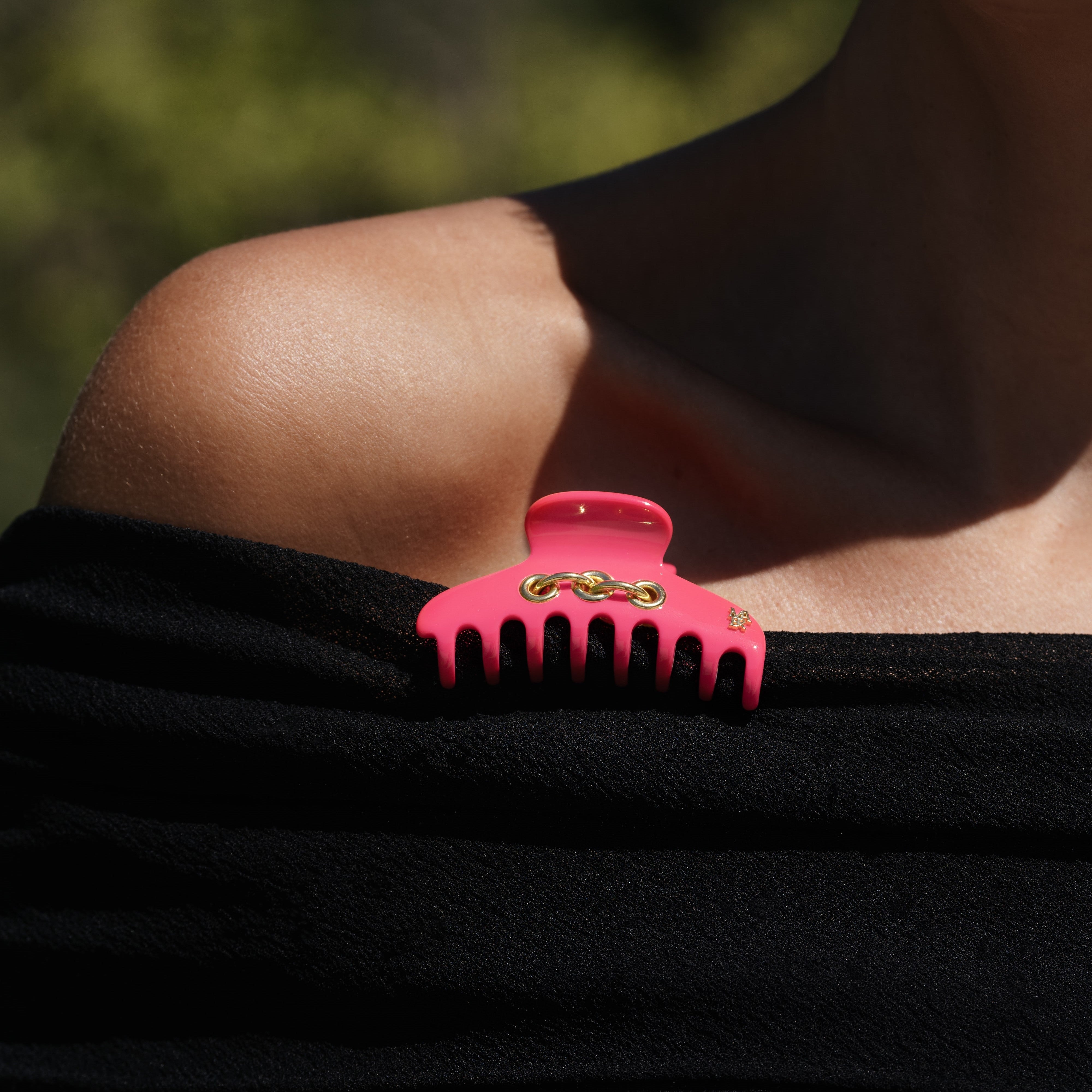La pince Eyelets est en acétate de cellulose italien, une matière d’origine naturelle venant de la fleur de coton, biodégradable et douce pour les cheveux. Les éléments décoratifs sont en laiton doré à l’or fin.