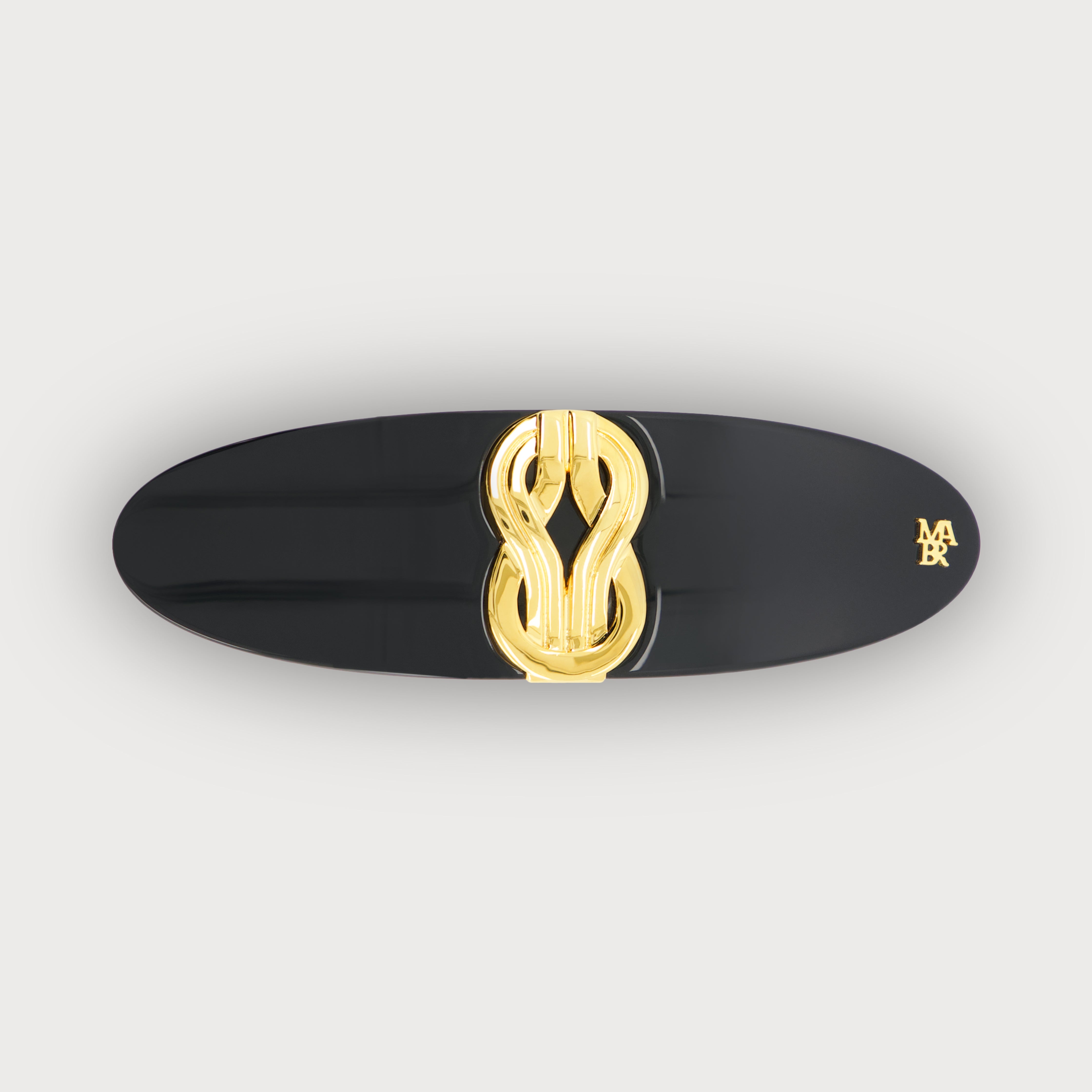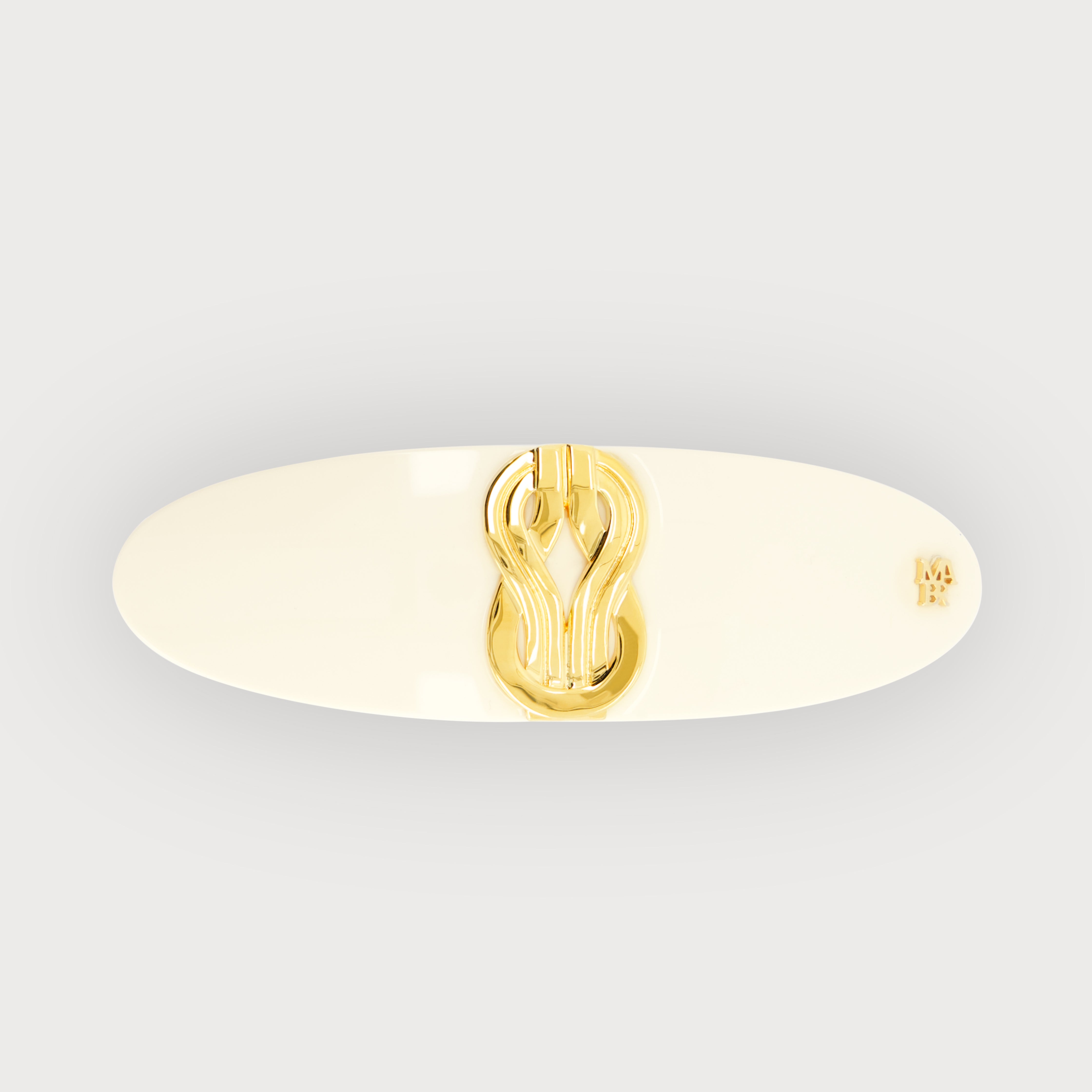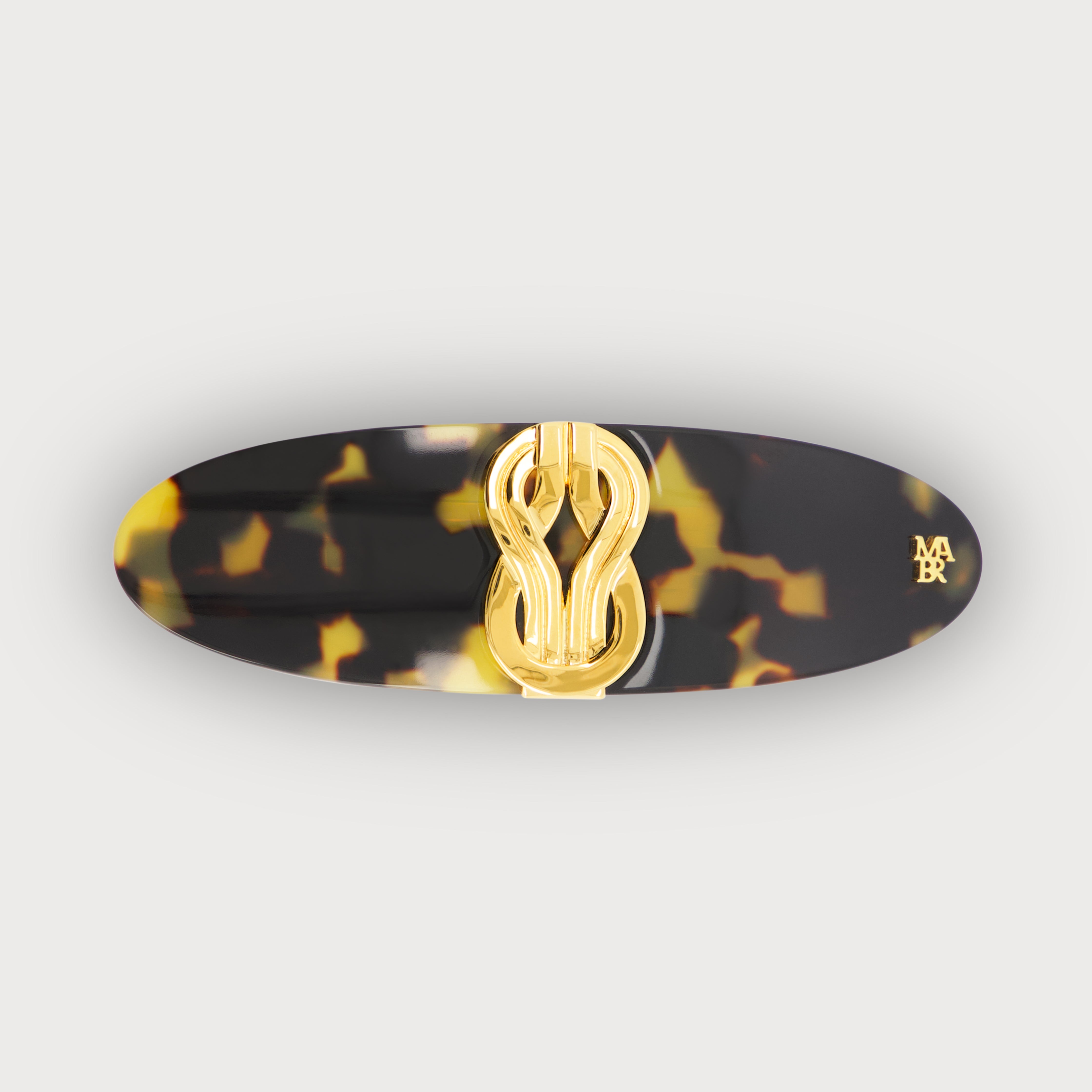 La barrette Knot Or est en acétate de cellulose italien, une matière d’origine naturelle venant de la fleur de coton, biodégradable et douce pour les cheveux. Les éléments décoratifs sont en laiton doré à l’or fin.