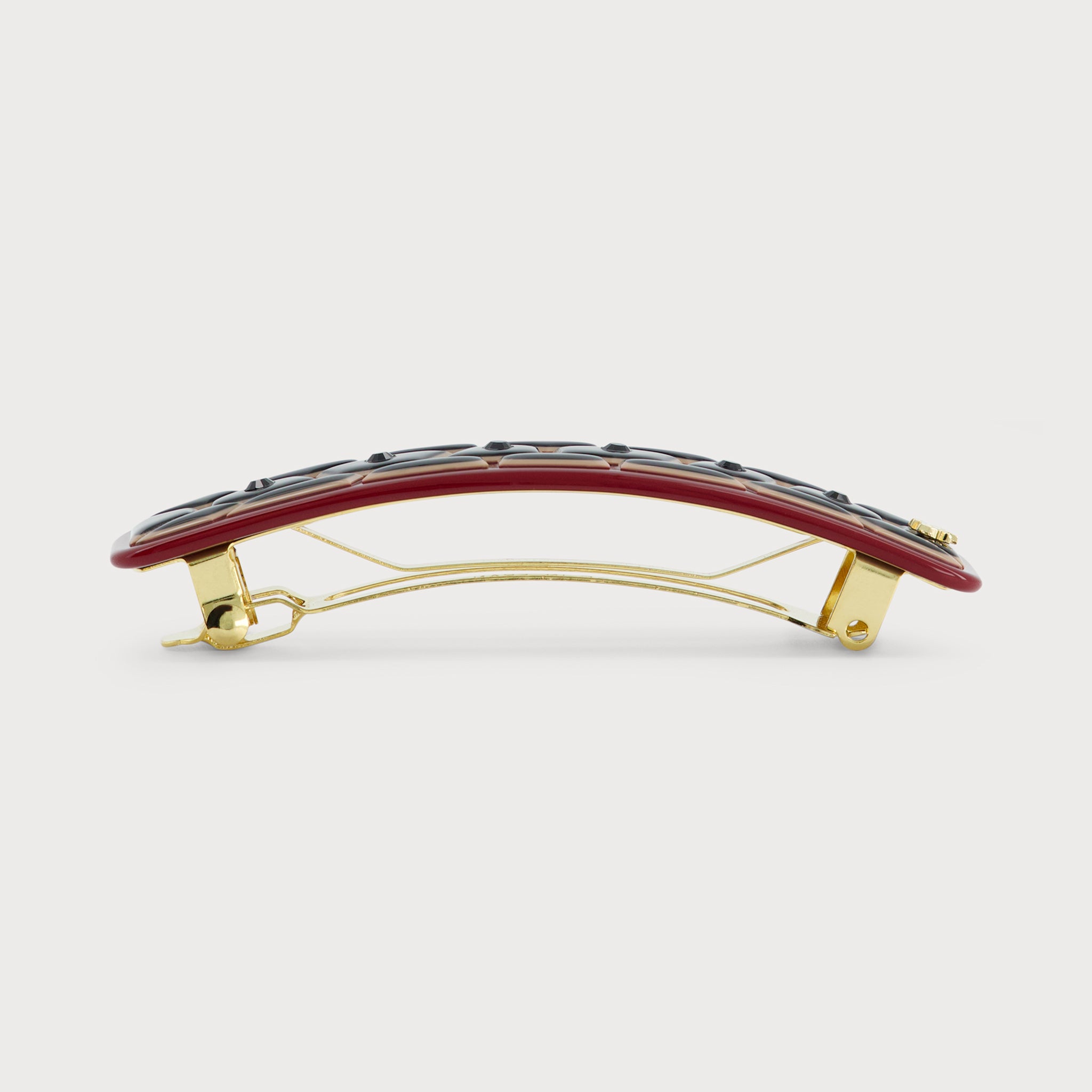 L'attache de la barrette mesure 8,5cm, une longueur idéale pour les cheveux moyennement denses à très épais. La barrette peut se porter en demi-queue sur cheveux courts, et en queue de cheval sur cheveux mi-longs à très longs. Pour plus de conseils, voir notre guide des tailles.