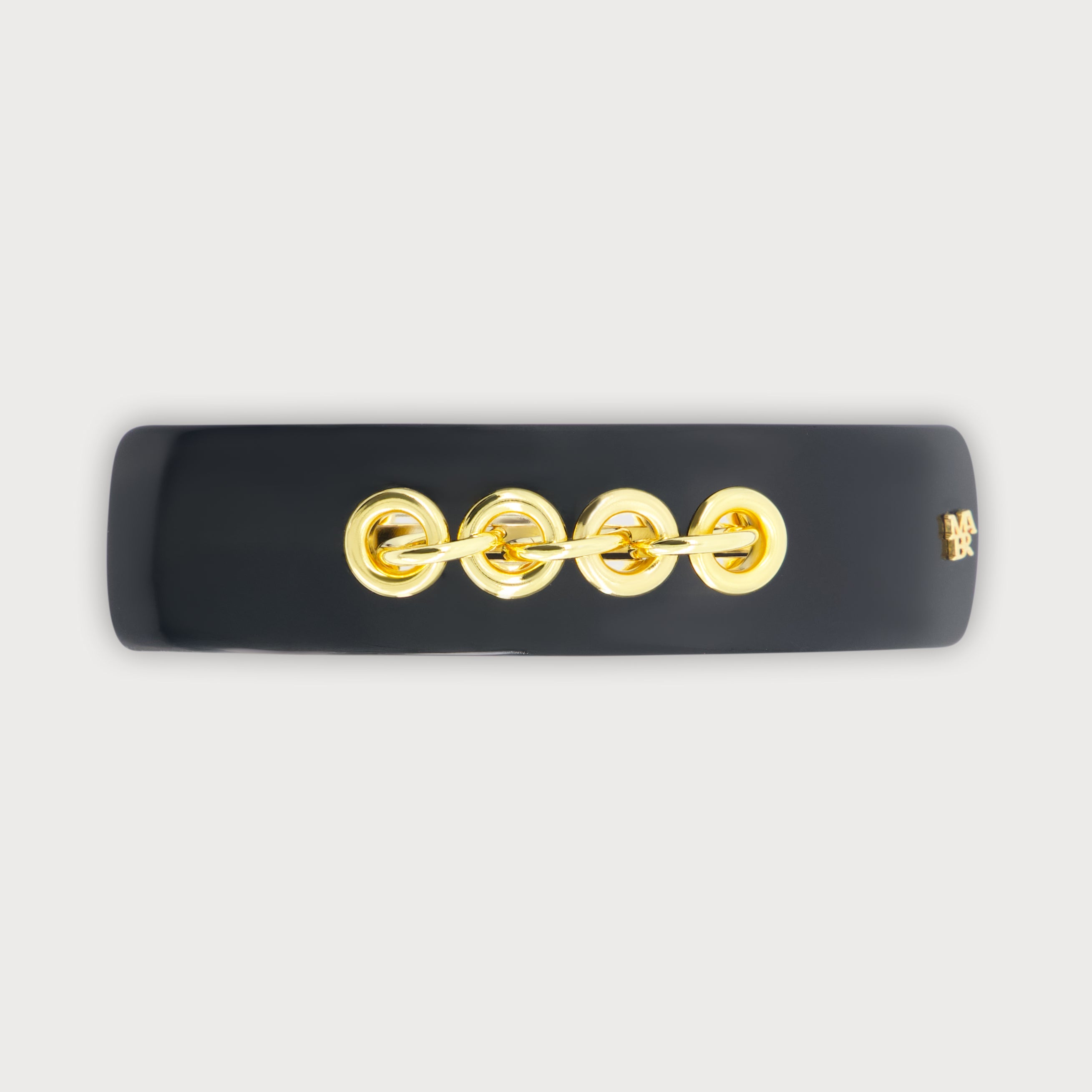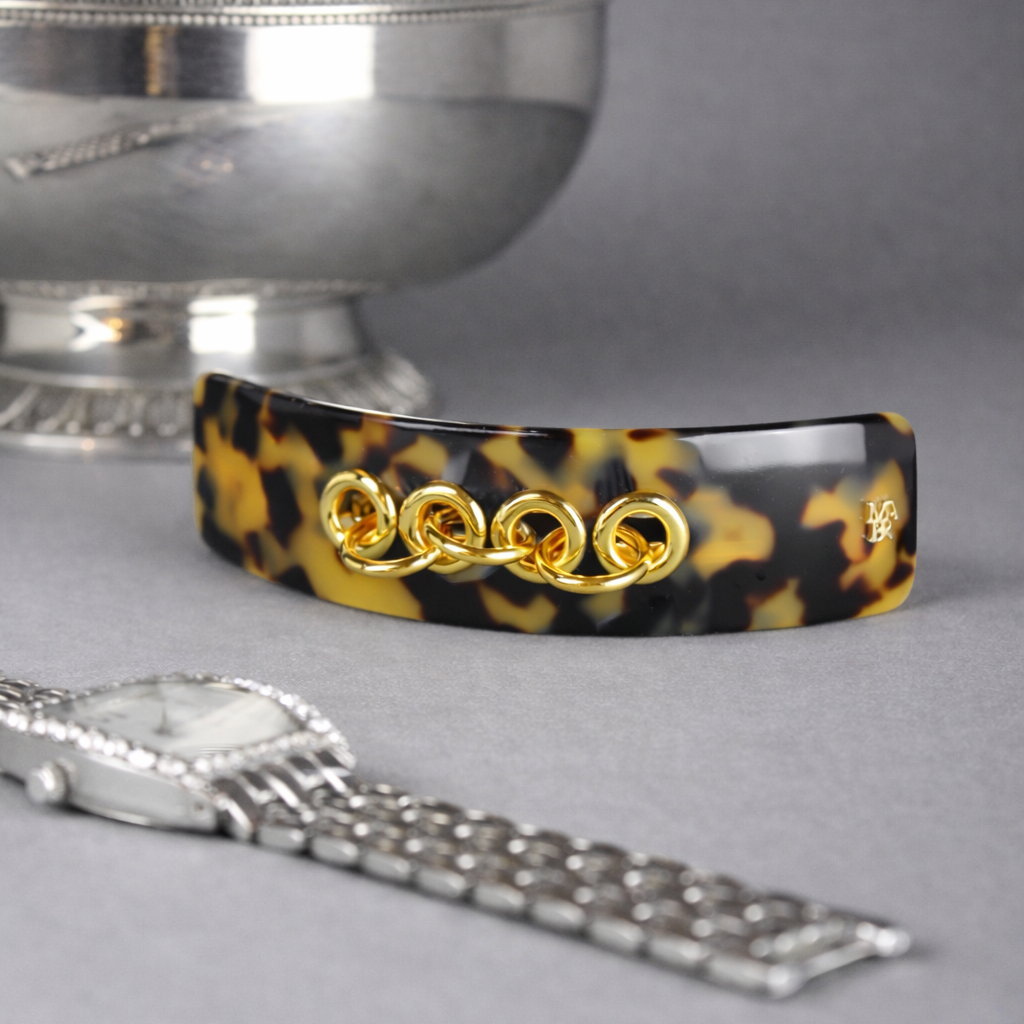 La barrette à cheveux Eyelets est en acétate de cellulose italien, une matière d’origine naturelle venant de la fleur de coton, biodégradable et douce pour les cheveux. Les éléments décoratifs sont en laiton doré à l’or fin.