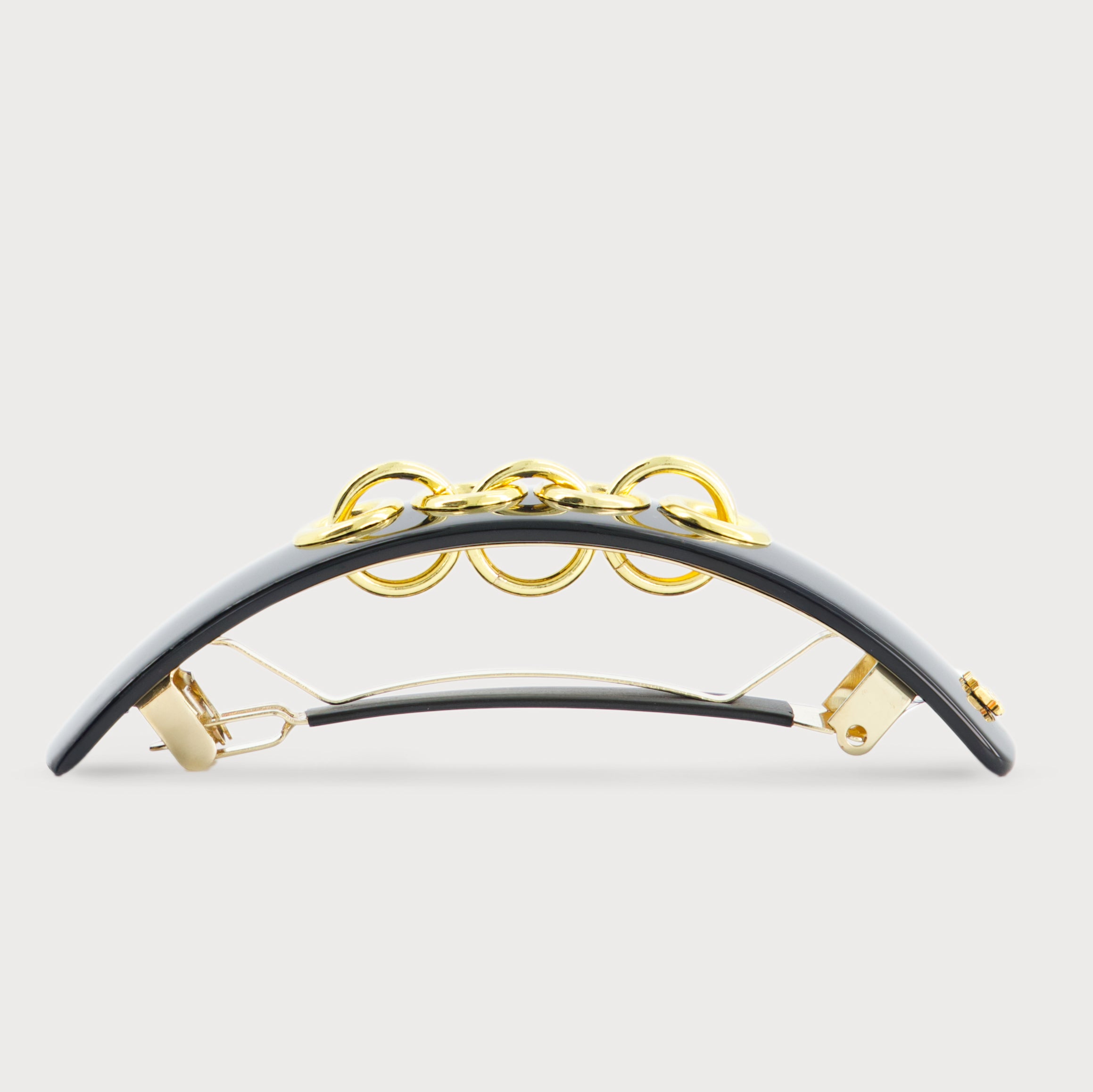 Imaginée à Paris par notre studio créatif et fabriquée à la main dans le Jura par nos ateliers, la barrette à cheveux Eyelets est une pièce de luxe intégralement Made in France. D’une inspiration initialement très présente dans les univers de la joaillerie et de la maroquinerie, Mauliébris reprend les codes et concepts, en ajourant ses pièces d’œillets et en jouant sur l’accumulation d’anneaux comme des piercings de peau. En laiton doré à l’or fin, les ornements de la ligne donnent à l’acétate un aspect précieux et « bijou », apportant une nouvelle modernité au produit. L'attache comporte notre mécanisme anti-glisse plébiscité par Vogue, qui protège le cheveu et permet de le maintenir dans la chevelure. La barrette peut être personnalisée avec une initiale.