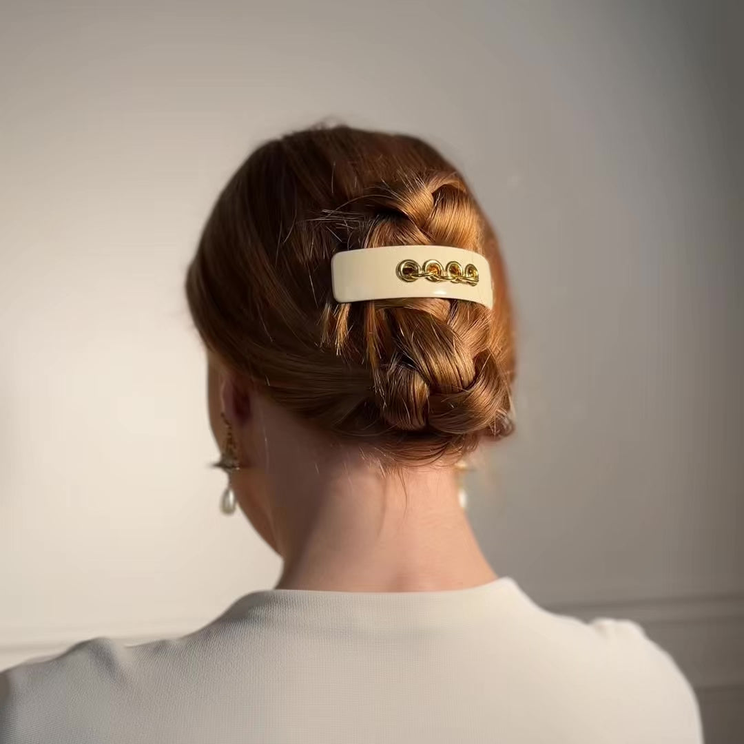 La barrette à cheveux Eyelets est en acétate de cellulose italien, une matière d’origine naturelle venant de la fleur de coton, biodégradable et douce pour les cheveux. Les éléments décoratifs sont en laiton doré à l’or fin.