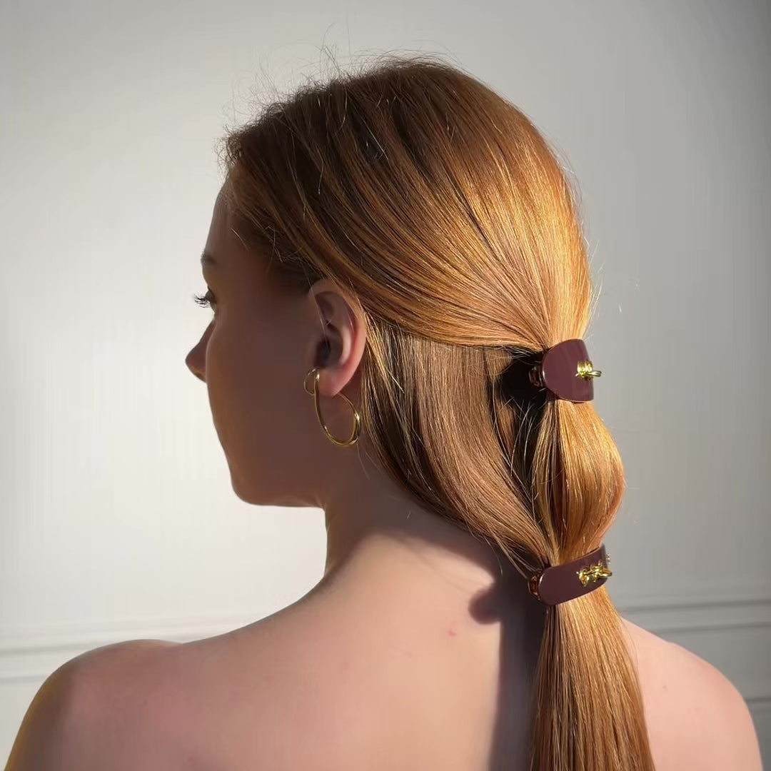 L'attache de la barrette mesure 8,5cm, une longueur idéale pour les cheveux moyennement denses à très épais. La barrette peut se porter en demi-queue sur cheveux courts, et en queue de cheval sur cheveux mi-longs à très longs. Pour plus de conseils, voir notre guide des tailles.