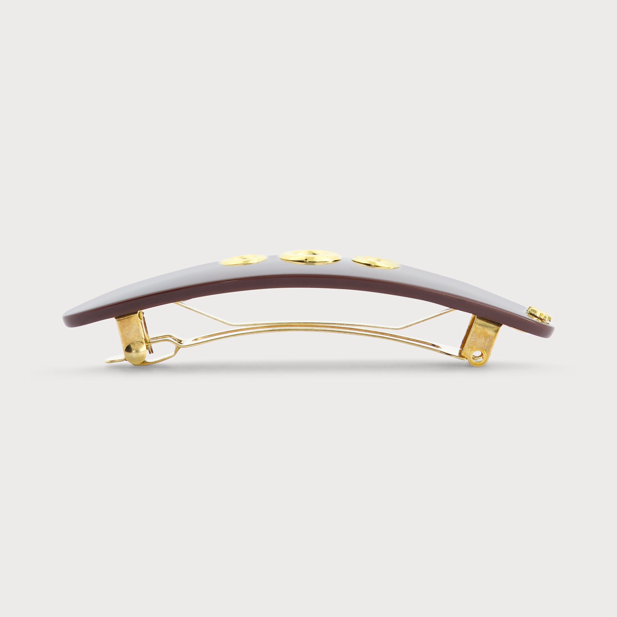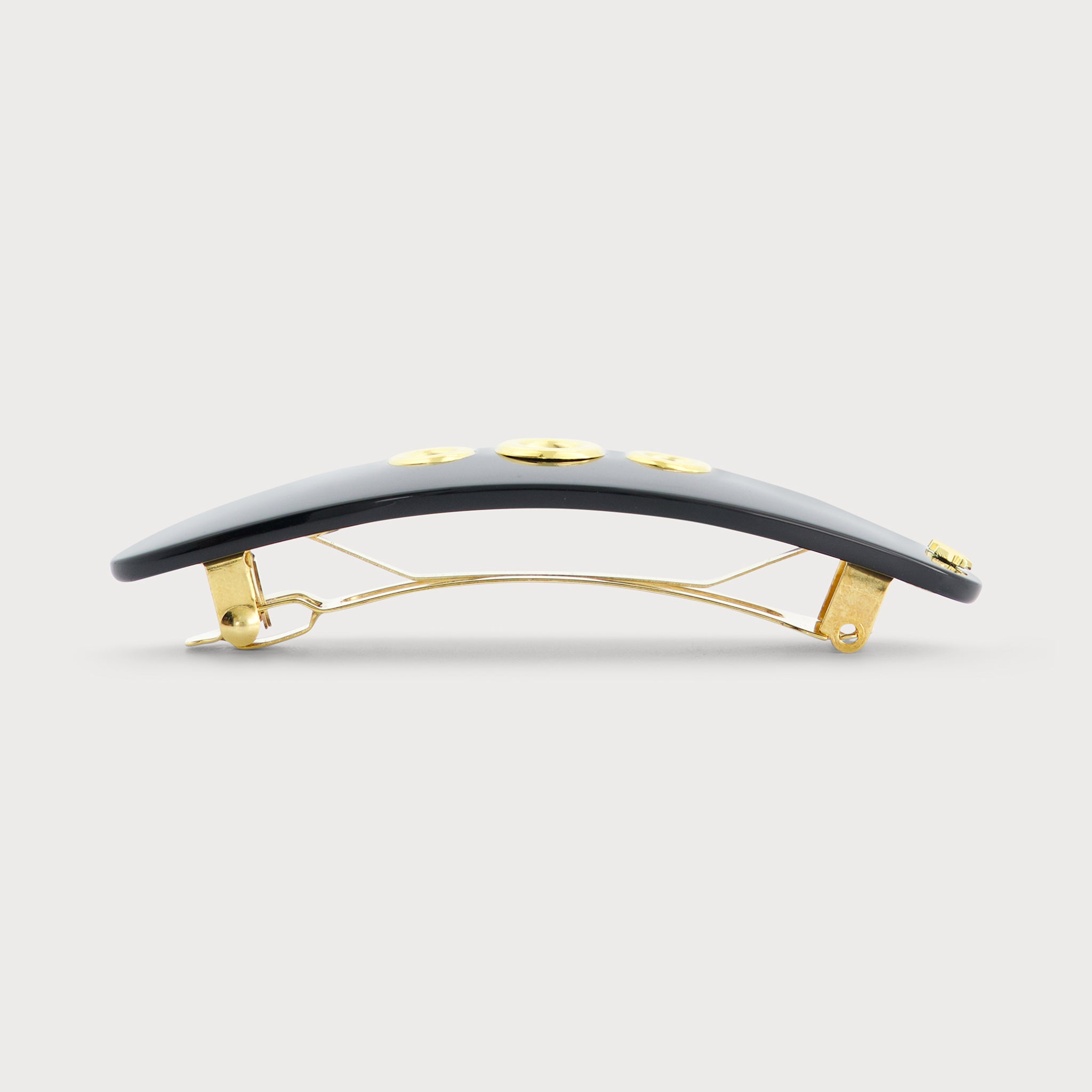Imaginée à Paris par notre studio créatif et fabriquée à la main dans le Jura par nos ateliers, la barrette à cheveux Eyelets Only est une pièce de luxe intégralement Made in France. D’une inspiration initialement très présente dans les univers de la mode et de la maroquinerie, Mauliébris reprend les codes et concepts, en ajourant ses pièces d’œillets en accumulation. En laiton doré à l’or fin, les ornements de la ligne donnent à l’acétate un aspect précieux et « bijou », apportant une nouvelle modernité au produit. L'attache comporte notre mécanisme anti-glisse plébiscité par Vogue, qui protège le cheveu et permet de le maintenir dans la chevelure.