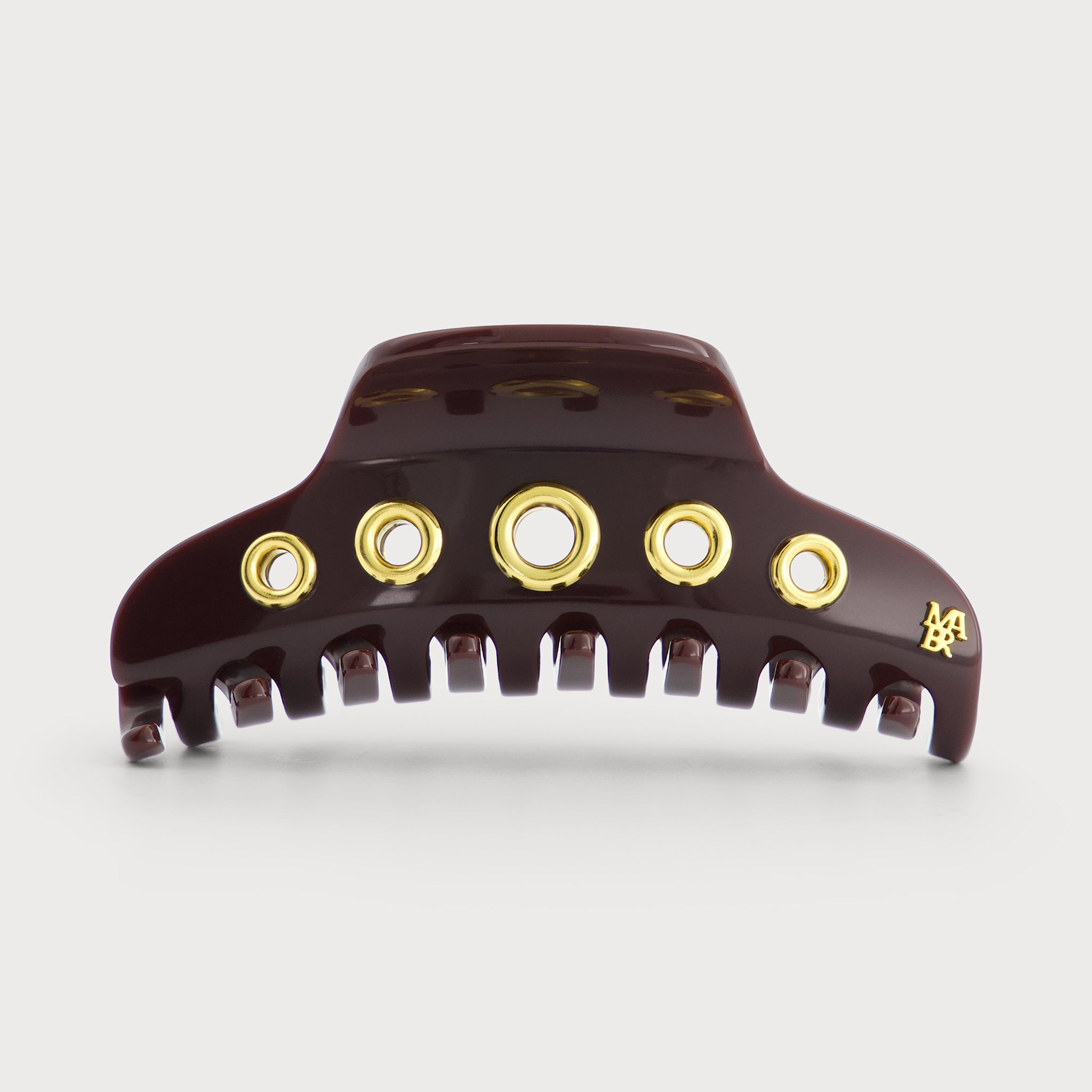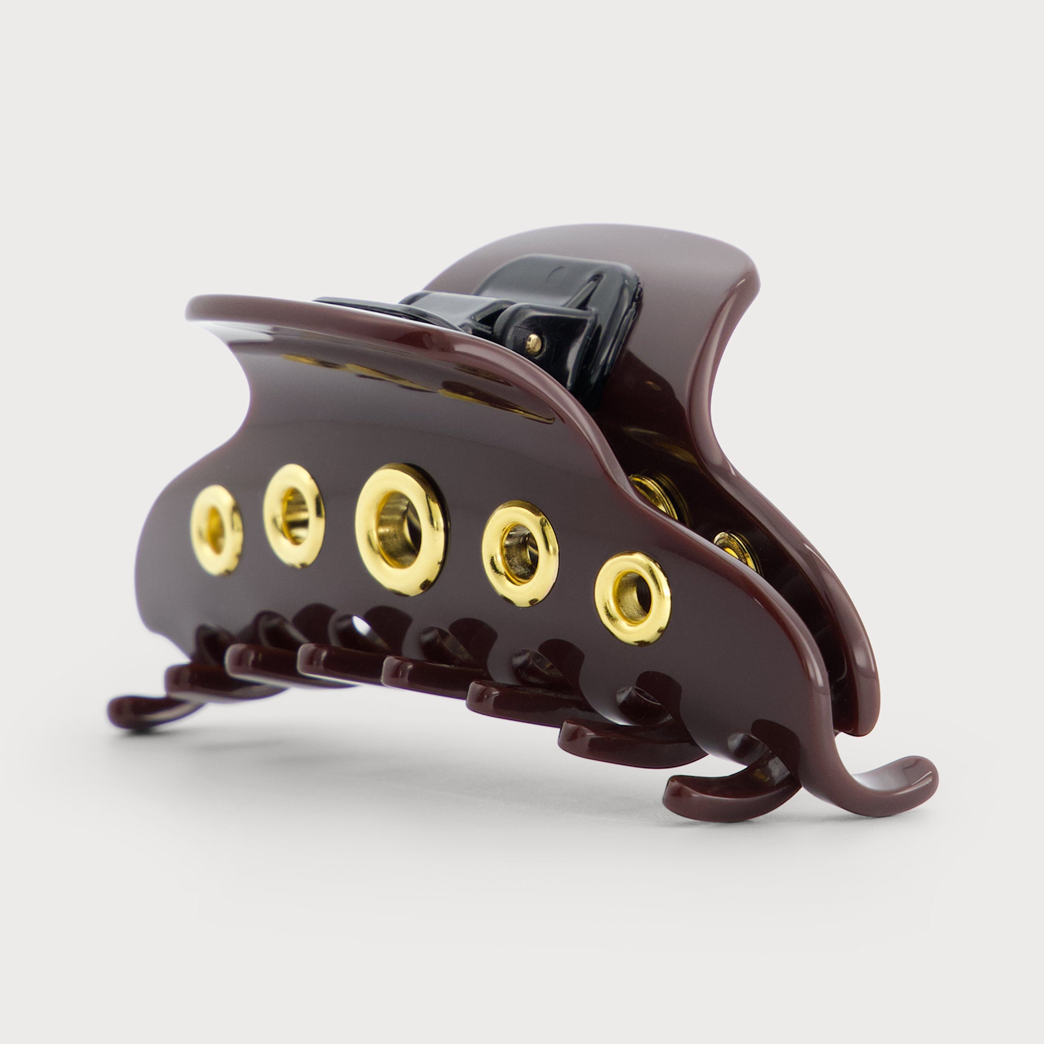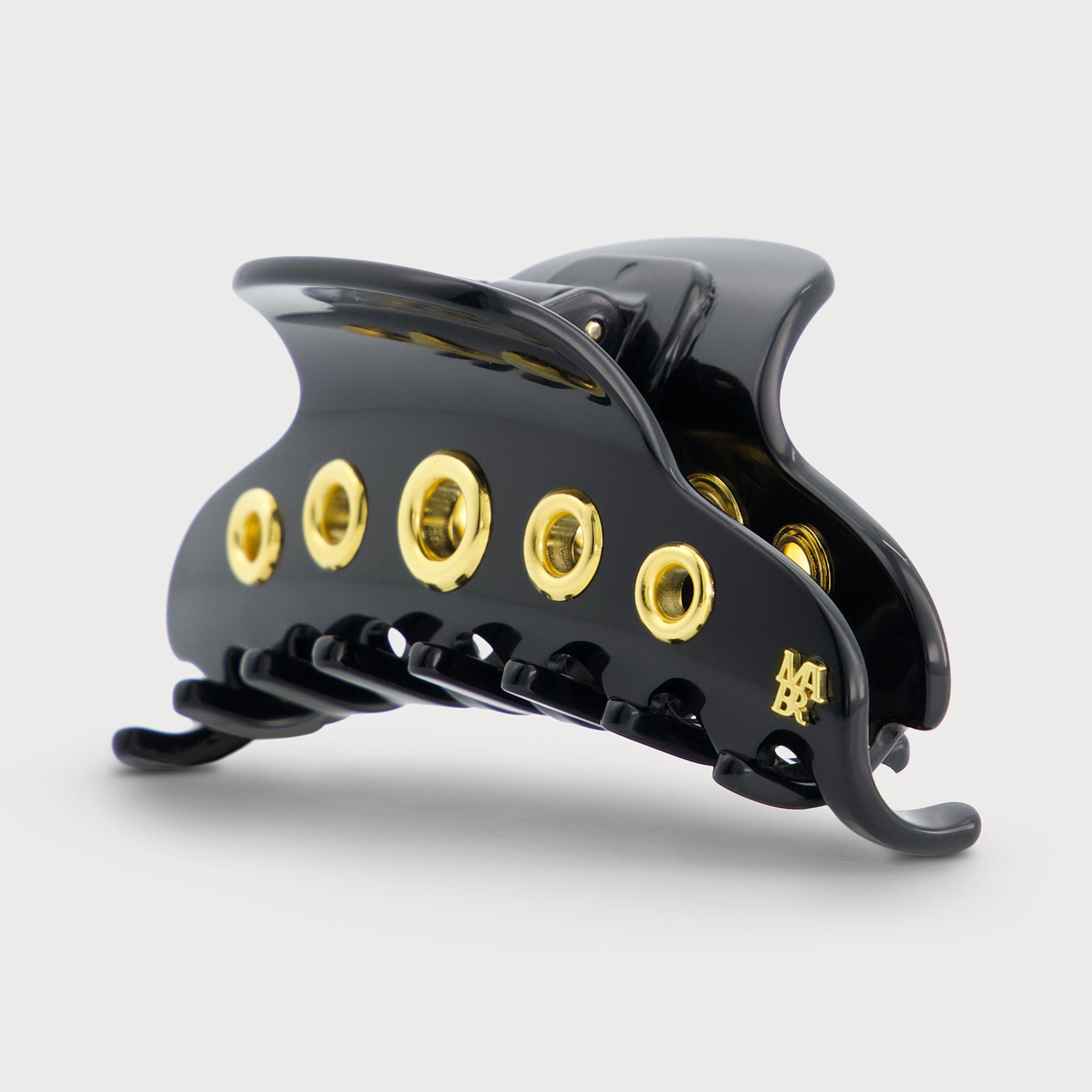 La pince à cheveux Eyelets Only est en acétate de cellulose italien, une matière d’origine naturelle venant de la fleur de coton, biodégradable et douce pour les cheveux. Les éléments décoratifs sont en laiton doré à l’or fin.
