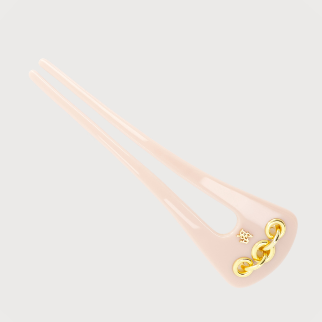 Imaginé à Paris en collaboration avec Kalon et fabriquée à la main dans le Jura par nos ateliers, le pic à chignon Eyelets est une pièce de luxe intégralement Made in France. D’une inspiration initialement très présente dans les univers de la joaillerie et de la maroquinerie, Mauliébris reprend les codes et concepts, en ajourant ses pièces d’œillets et en jouant sur l’accumulation d’anneaux comme des piercings de peau. En laiton doré à l’or fin, les ornements de la ligne donnent à l’acétate un aspect précieux et « bijou », apportant une nouvelle modernité au produit. La couleur de l'acétate, Nude Pink, est un nude subtilement rosée évoquant les voiles et costumes de scène — imaginée avec Kalon.