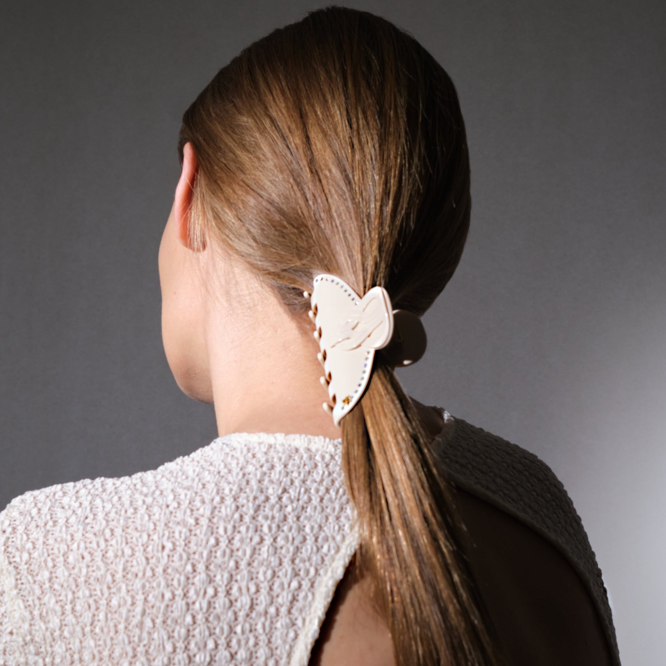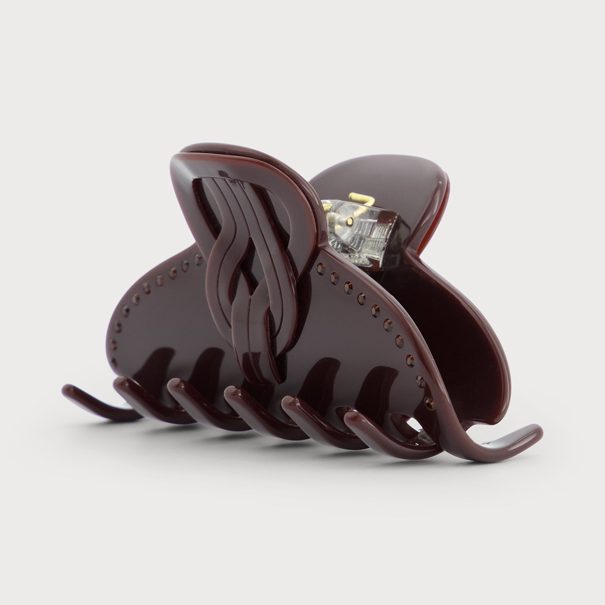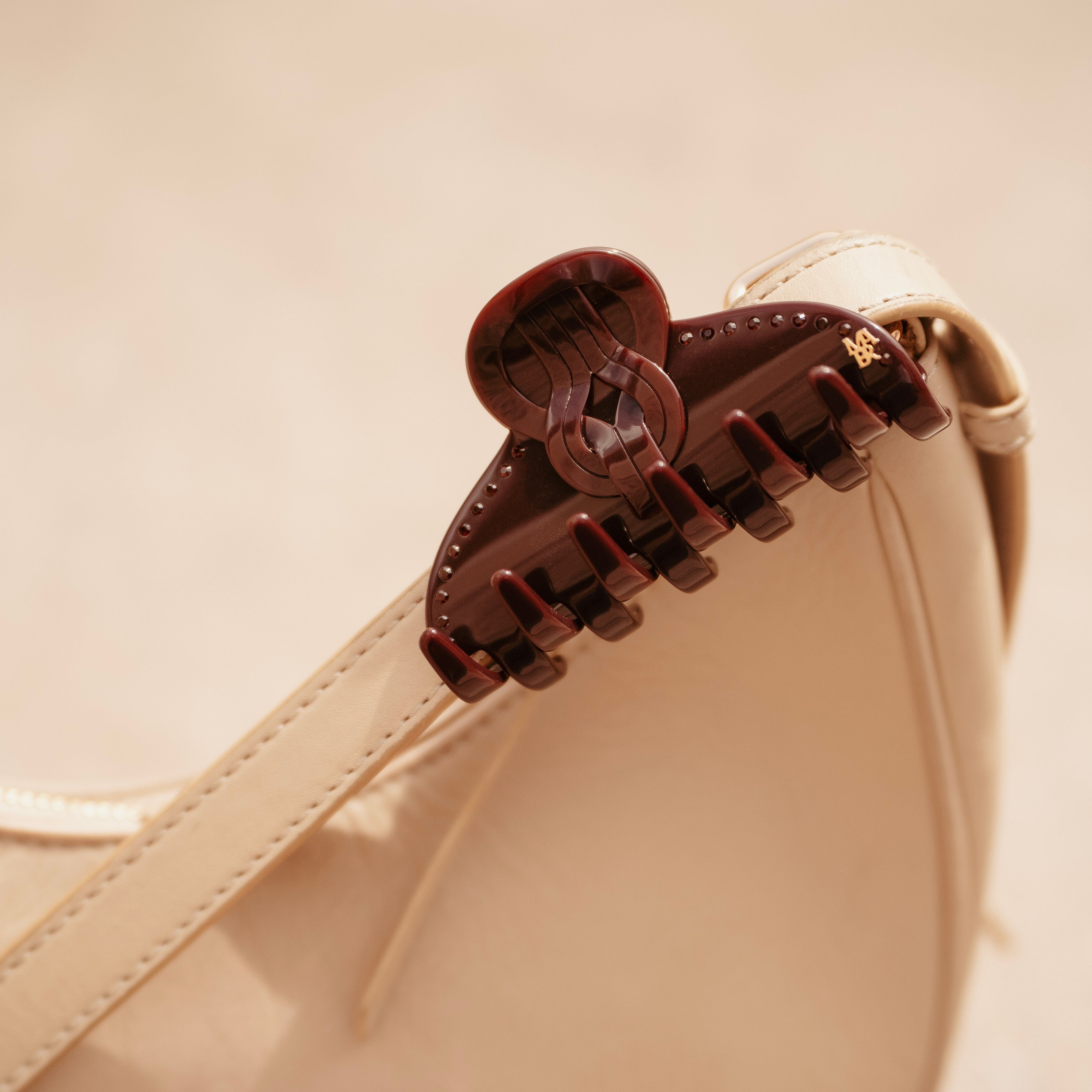 La pince Knot est en acétate de cellulose italien, une matière d’origine naturelle venant de la fleur de coton, biodégradable et respectueuse du cheveu.
