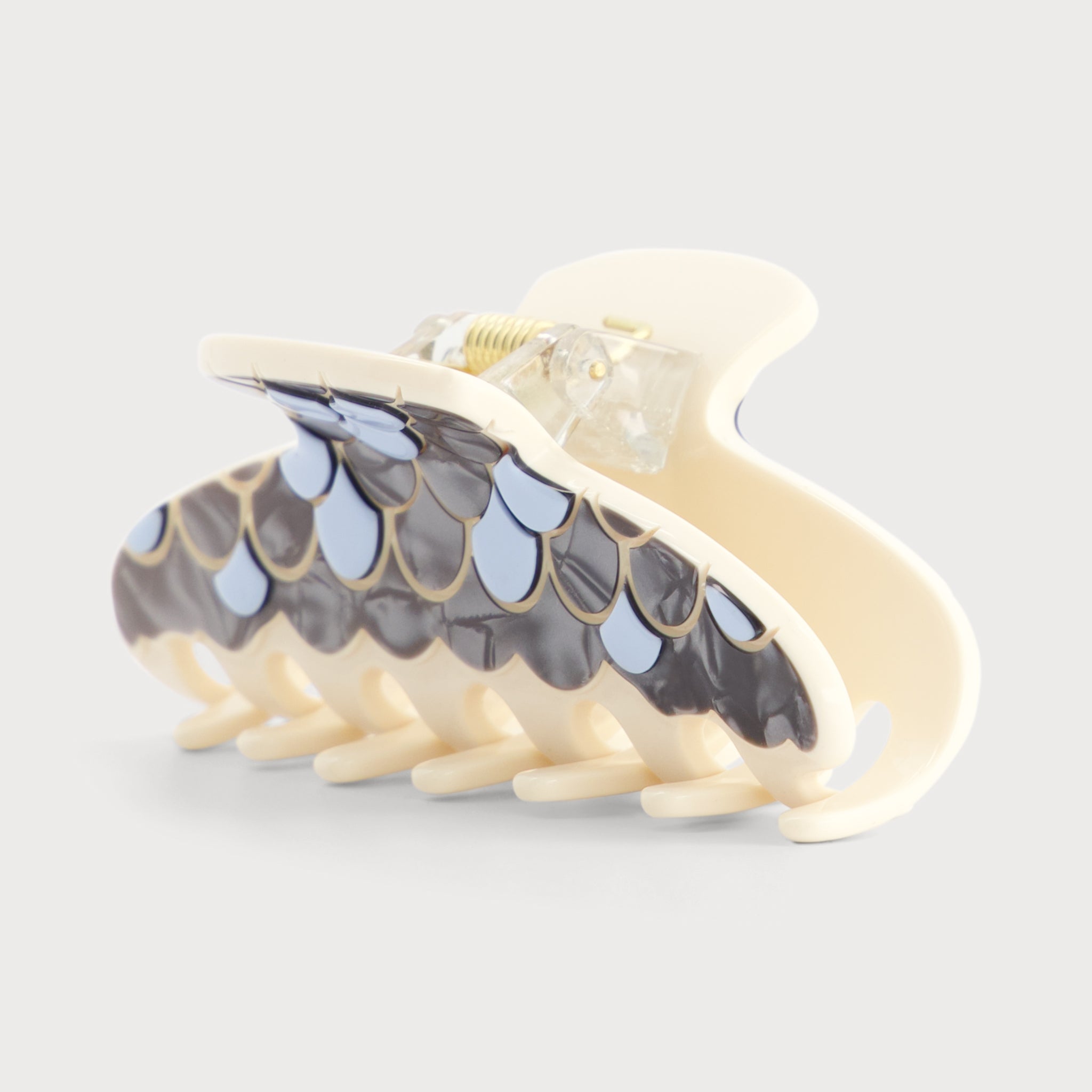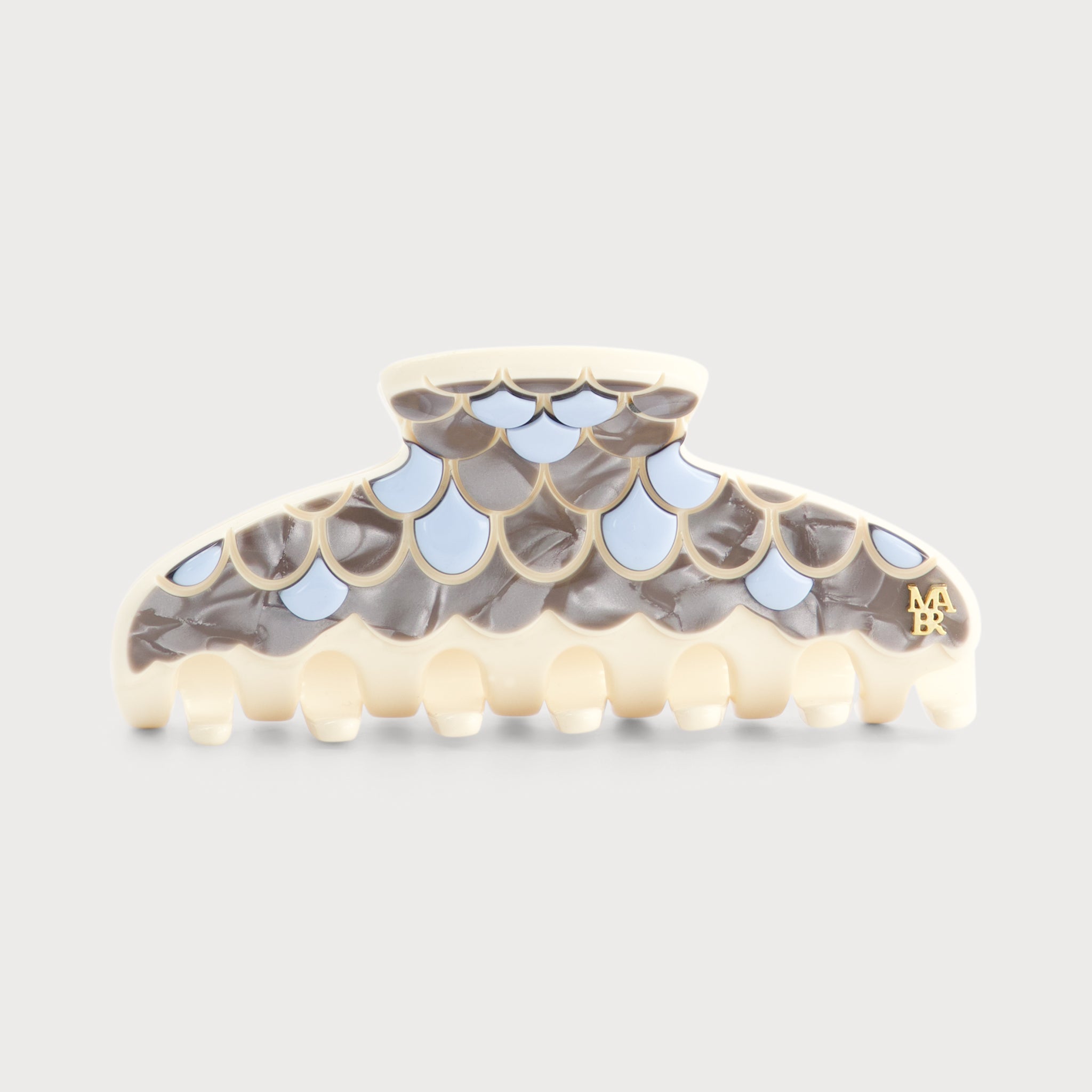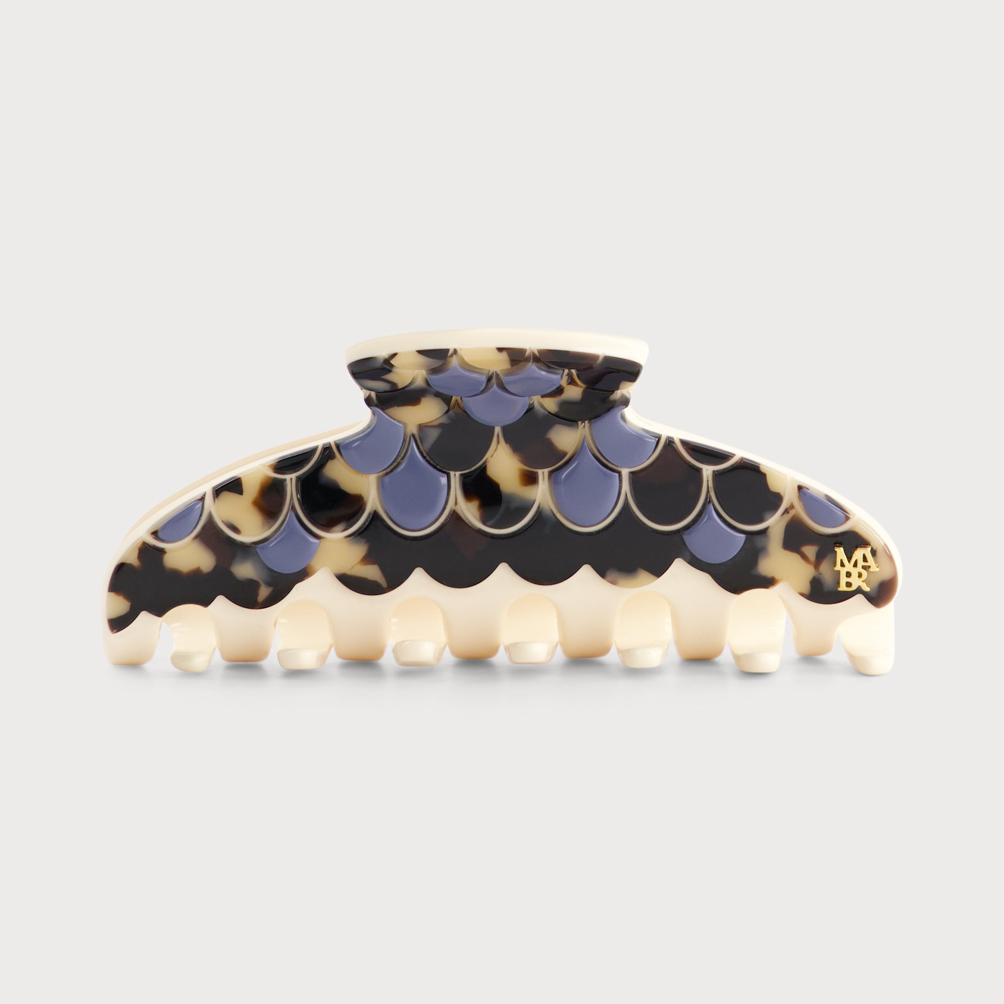 Imaginée à Paris par notre studio créatif et fabriquée à la main dans le Jura par nos ateliers, la pince Mermaid est une pièce de luxe intégralement Made in France. Formée d'un assemblage d'acétate en trois couleurs spécifiquement développé pour Mauliébris, la ligne déploie un jeu de fraisage complexe de la matière permettant de jouer sur les couleurs et les volumes. Les contours des écailles d'une sirène apparaissent alors, inspirés de la tendance Mermaidcore. Son ressort est souple et résistant, et ses dents arrondies et polies permettent un maintien doux pour les cheveux.