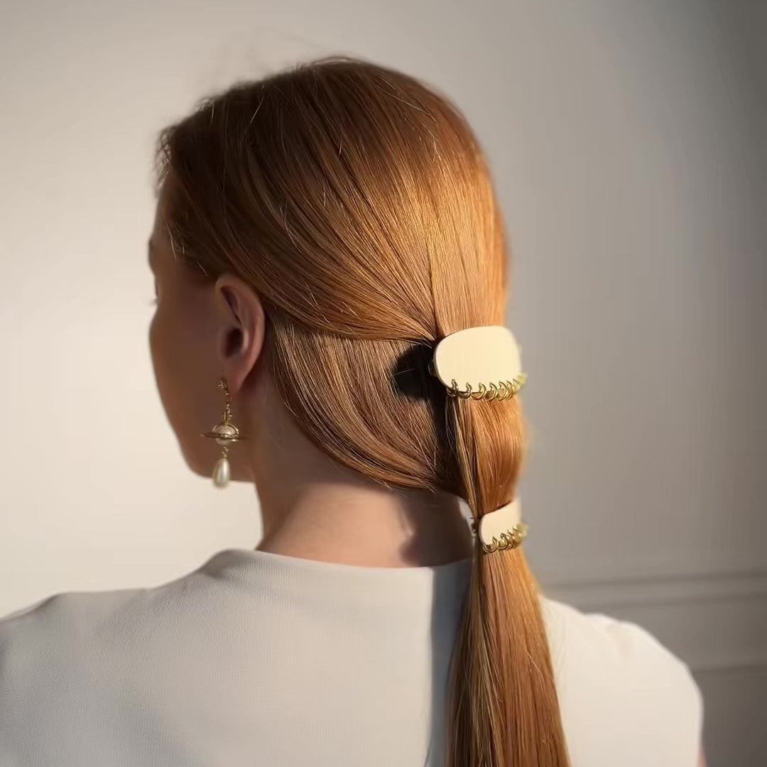 L'attache de la barrette mesure 8,5cm, une longueur idéale pour les cheveux moyennement denses à très épais. La barrette peut se porter en demi-queue sur cheveux courts, et en queue de cheval sur cheveux mi-longs à très longs. Pour plus de conseils, voir notre guide des tailles.