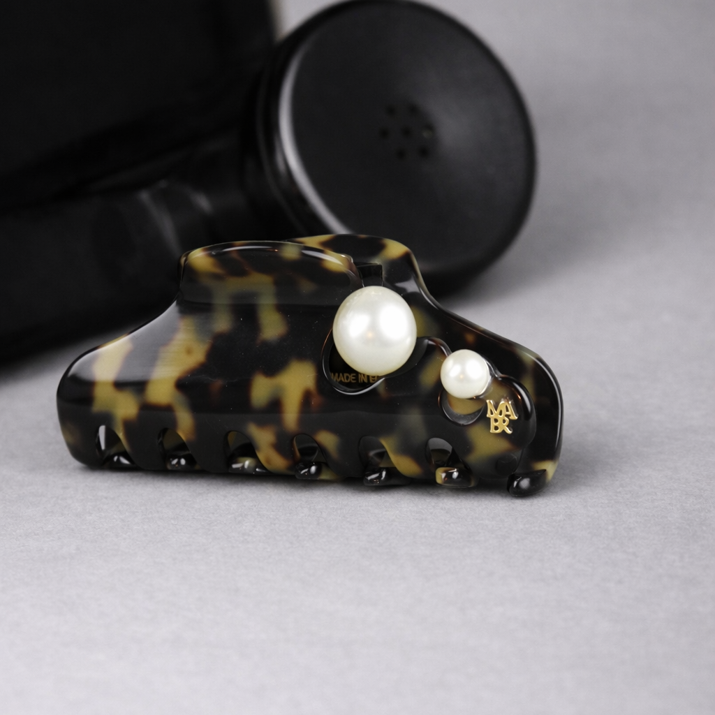 La Pince à cheveux Pearl est en acétate de cellulose italien, une matière d’origine naturelle venant de la fleur de coton, biodégradable et respectueuse du cheveu.