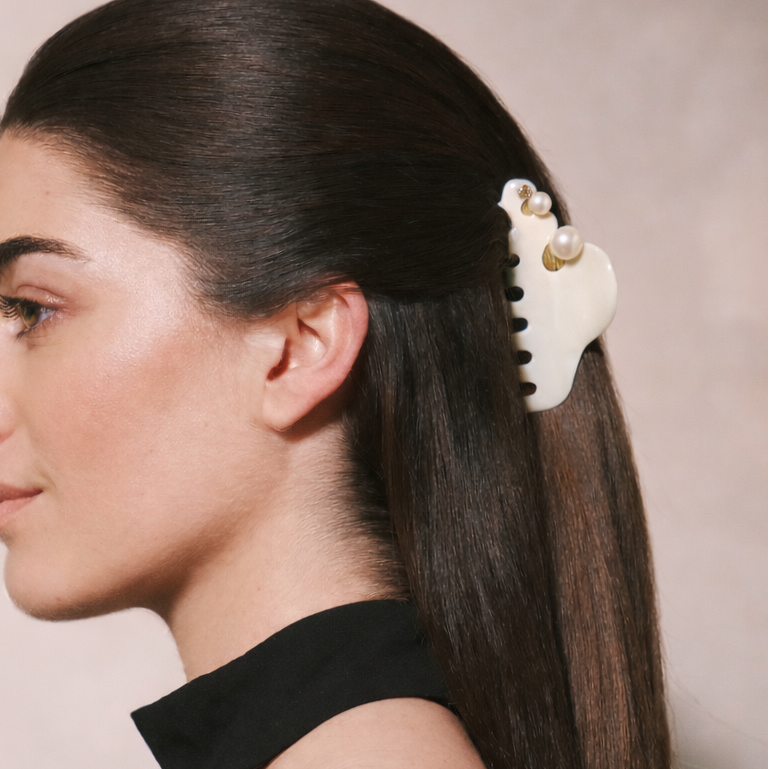 La Pince à cheveux Pearl est en acétate de cellulose italien, une matière d’origine naturelle venant de la fleur de coton, biodégradable et respectueuse du cheveu.