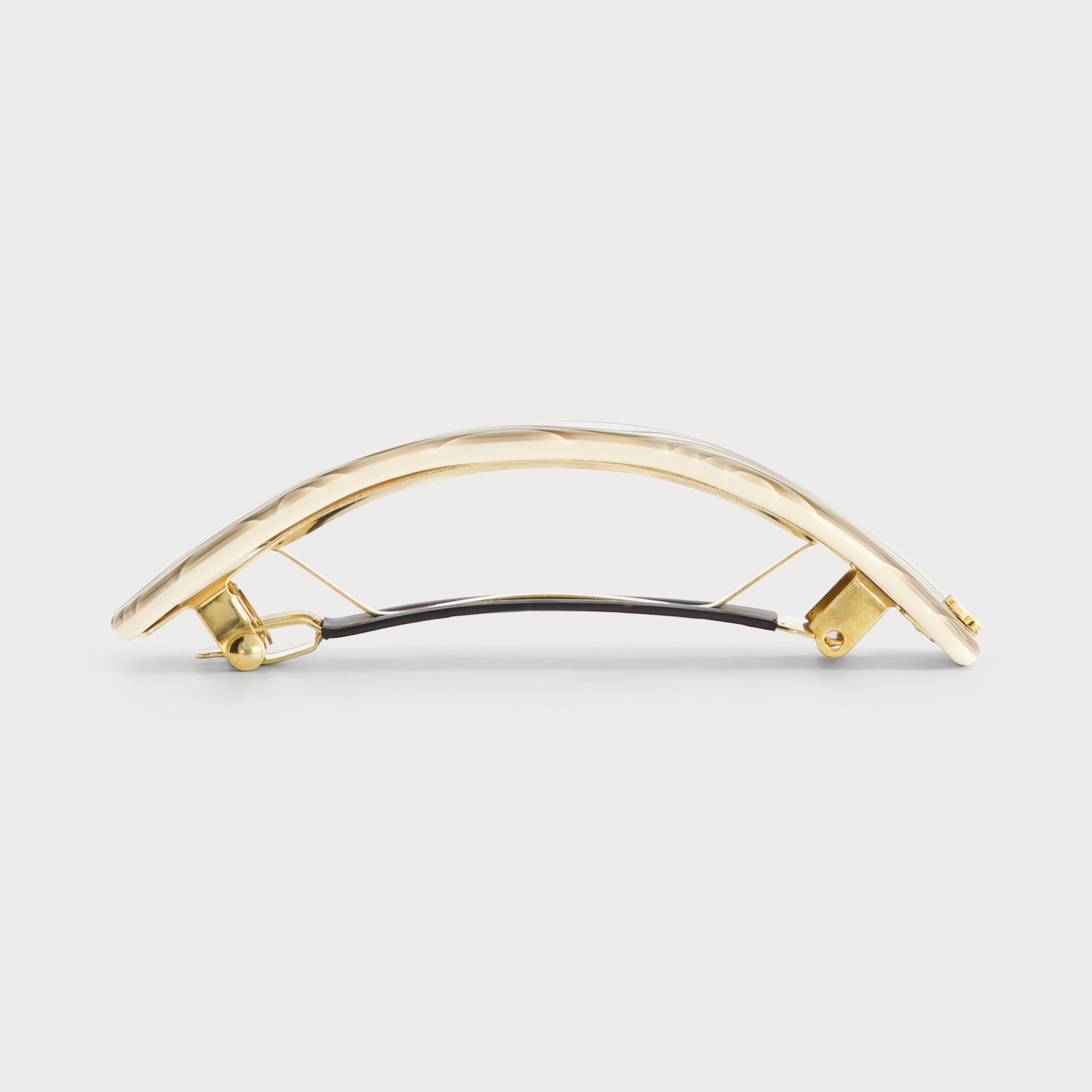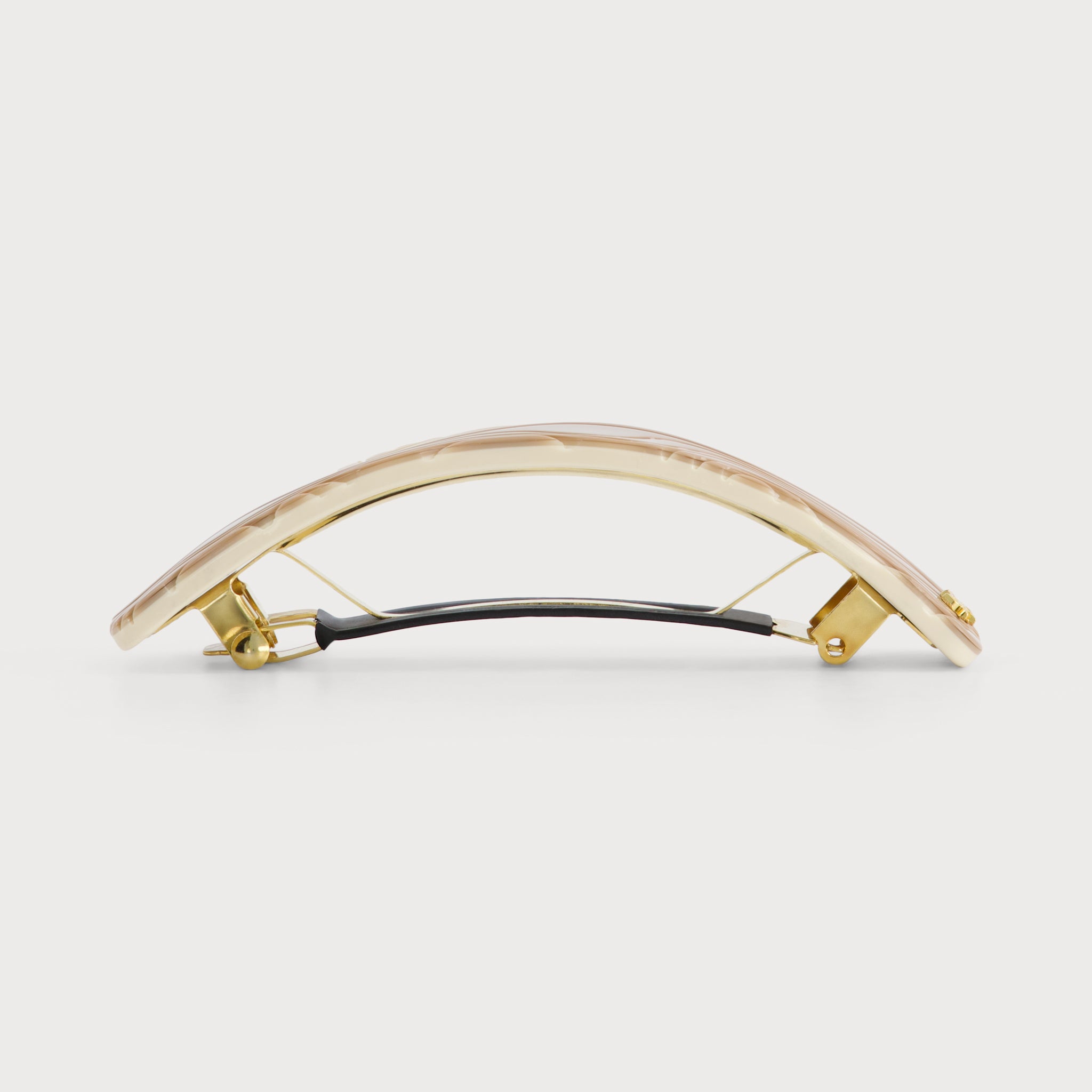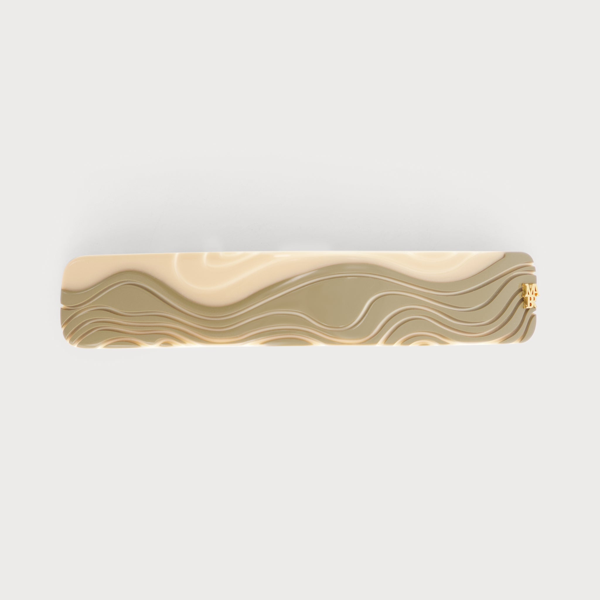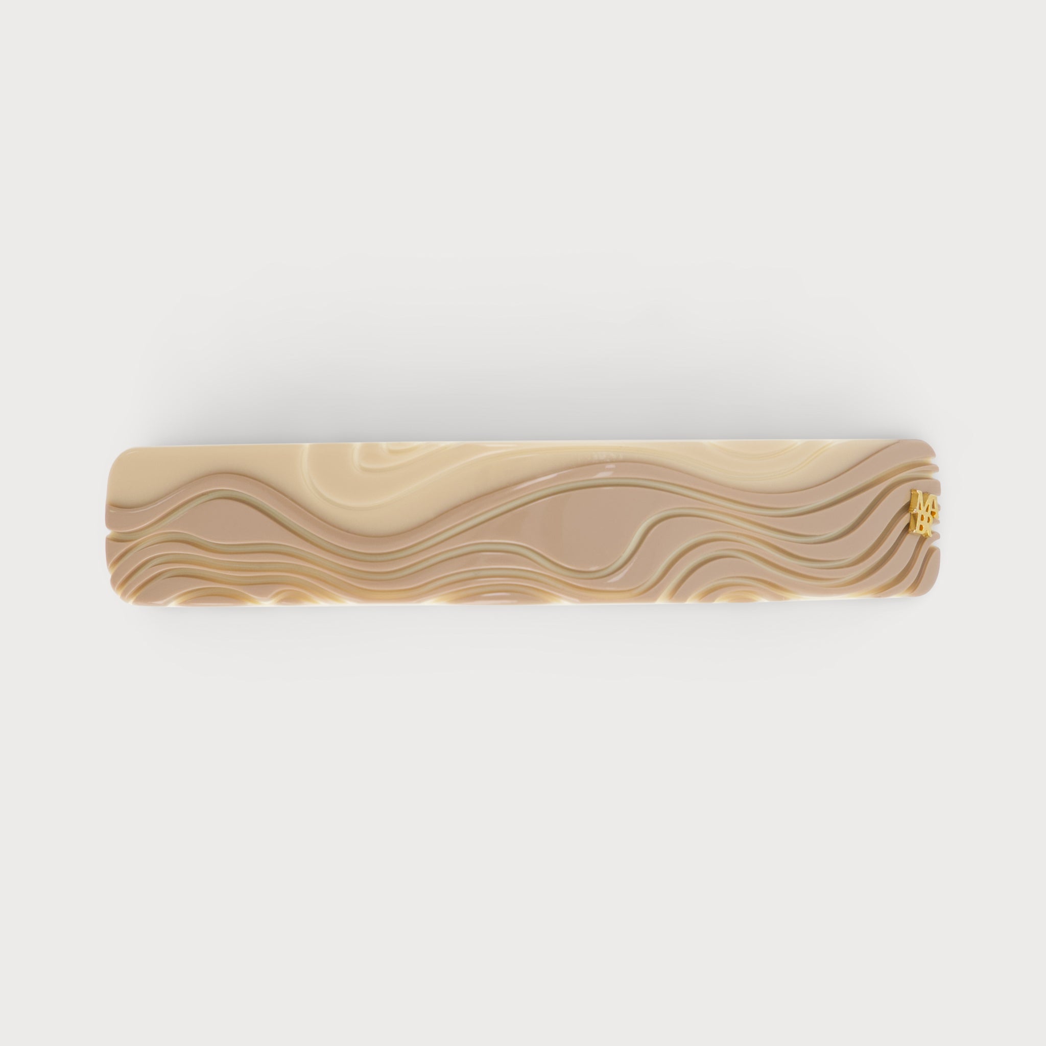 Imaginée à Paris par notre studio créatif et fabriquée à la main dans le Jura par nos ateliers, la barrette à cheveux Sand est intégralement Made in France. La ligne Sand dévoile des motifs organiques et sensuels inspirés de l'action du vent sur le sable. La matière est composée d'un plaquage sur mesure de trois couches d'acétate aux couleurs subtiles aux tonalités du désert. Le travail minutieux de gravure de la matière vient découvrir les couches internes et révéler le dégradés des teintes. Avec son fermoir automatique simple et doux pour les cheveux, la barrette Sand peut se porter en demi-queue, queue de cheval ou pour soutenir un chignon. L'attache comporte notre mécanisme anti-glisse plébiscité par Vogue, qui protège les cheveux et permet de maintenir la pièce dans la chevelure.