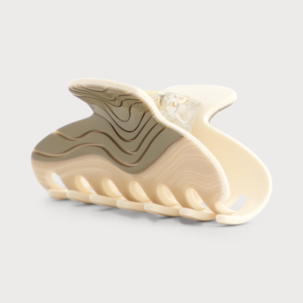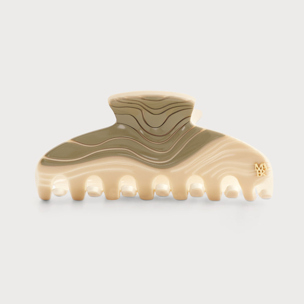 Imaginée à Paris par notre studio créatif et fabriquée à la main dans le Jura par nos ateliers, la Pince à cheveux Sand est intégralement Made in France. La ligne Sand dévoile des motifs organiques et sensuels inspirés de l'action du vent sur le sable. La matière est composée d'un plaquage sur mesure de trois couches d'acétate aux couleurs subtiles aux tonalités du désert. Le travail minutieux de gravure de la matière vient découvrir les couches internes et révéler le dégradés des teintes. Son ressort est souple et résistant, et ses dents arrondies et polies permettent un maintien doux pour les cheveux.