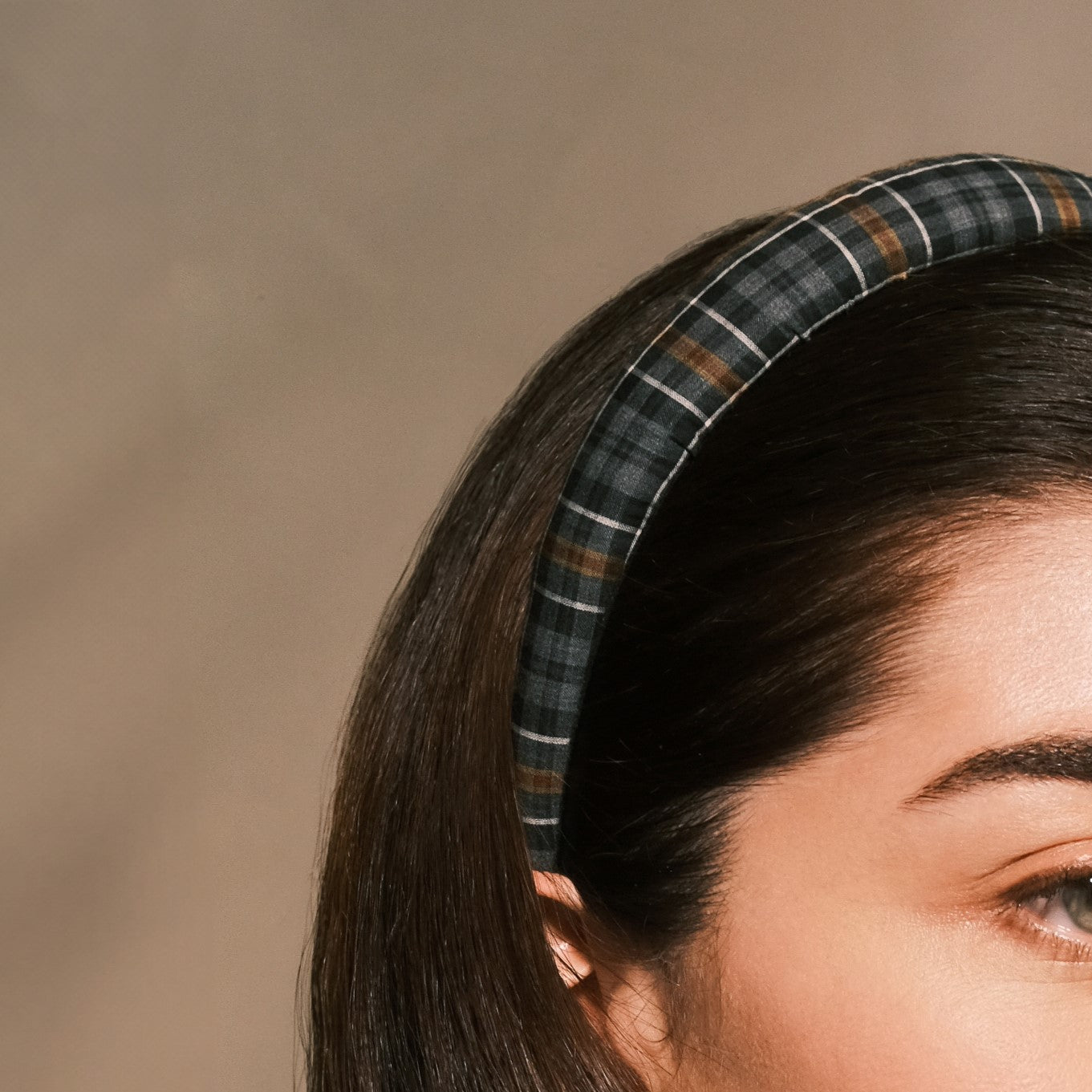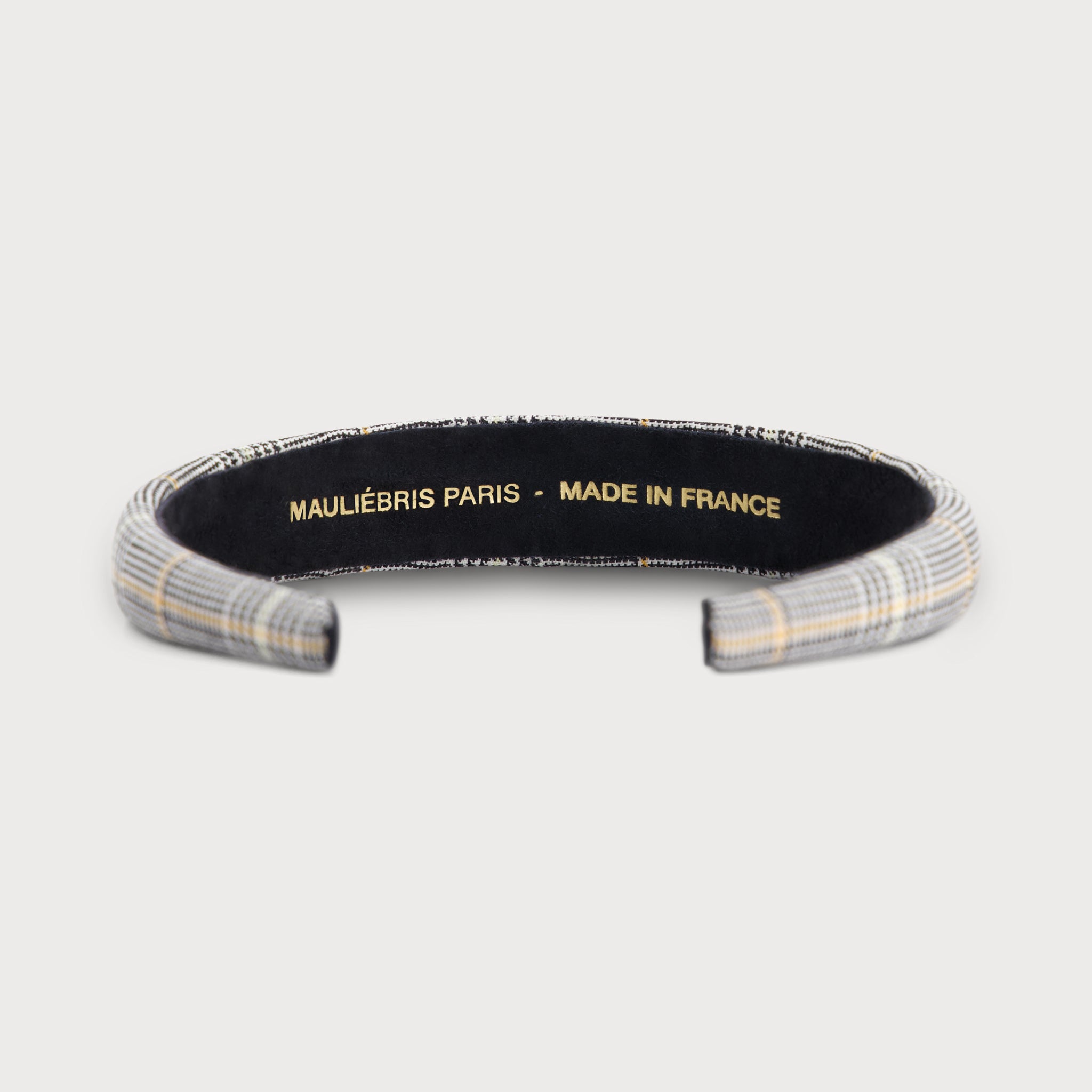 Le serre-tête Amandine est en tissu Prince de Galles.