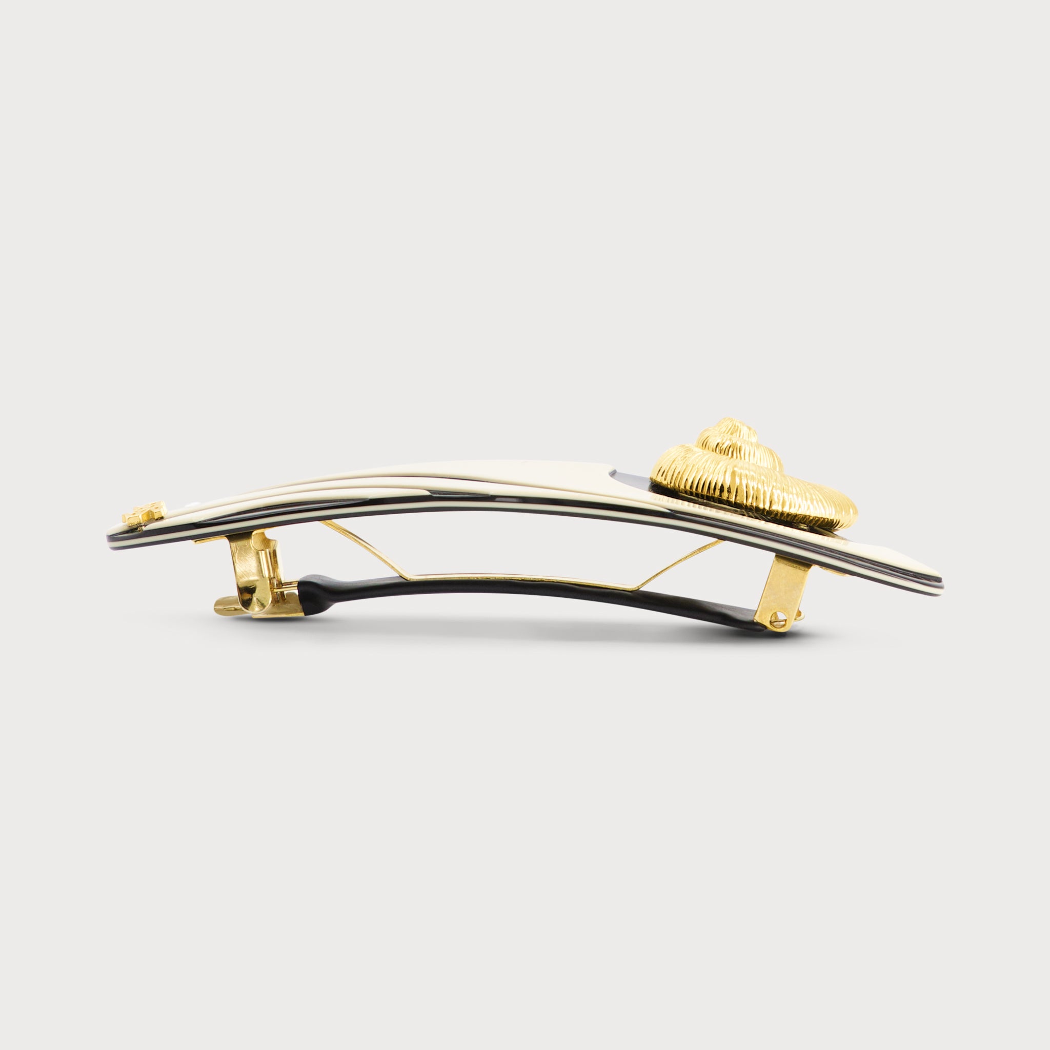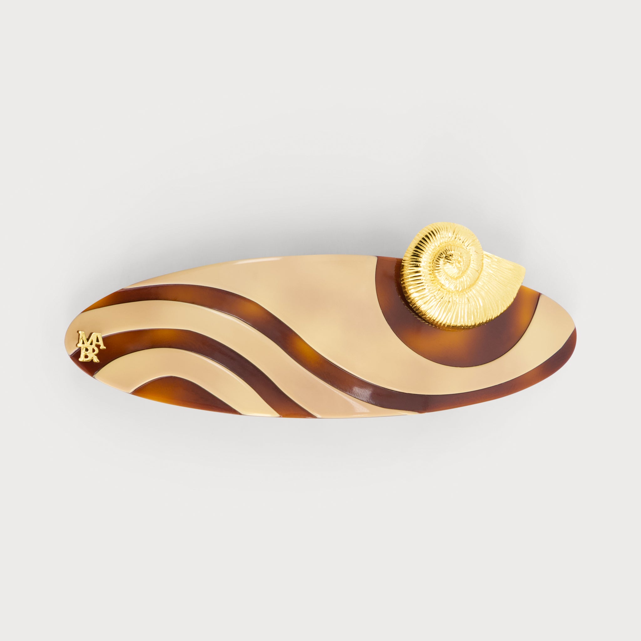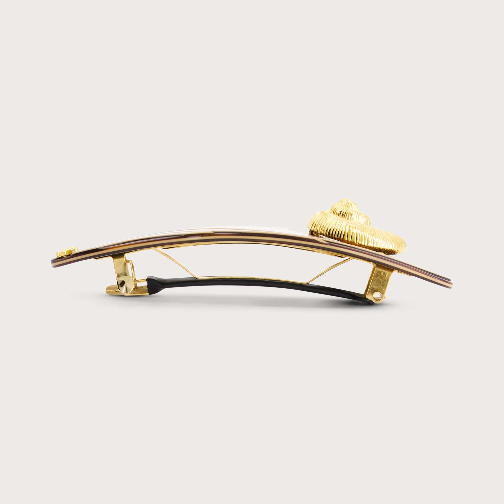 La barrette Shell est en laiton massif doré et en acétate de cellulose, une matière d’origine naturelle venant de la fleur de coton, biodégradable et douce pour les cheveux.